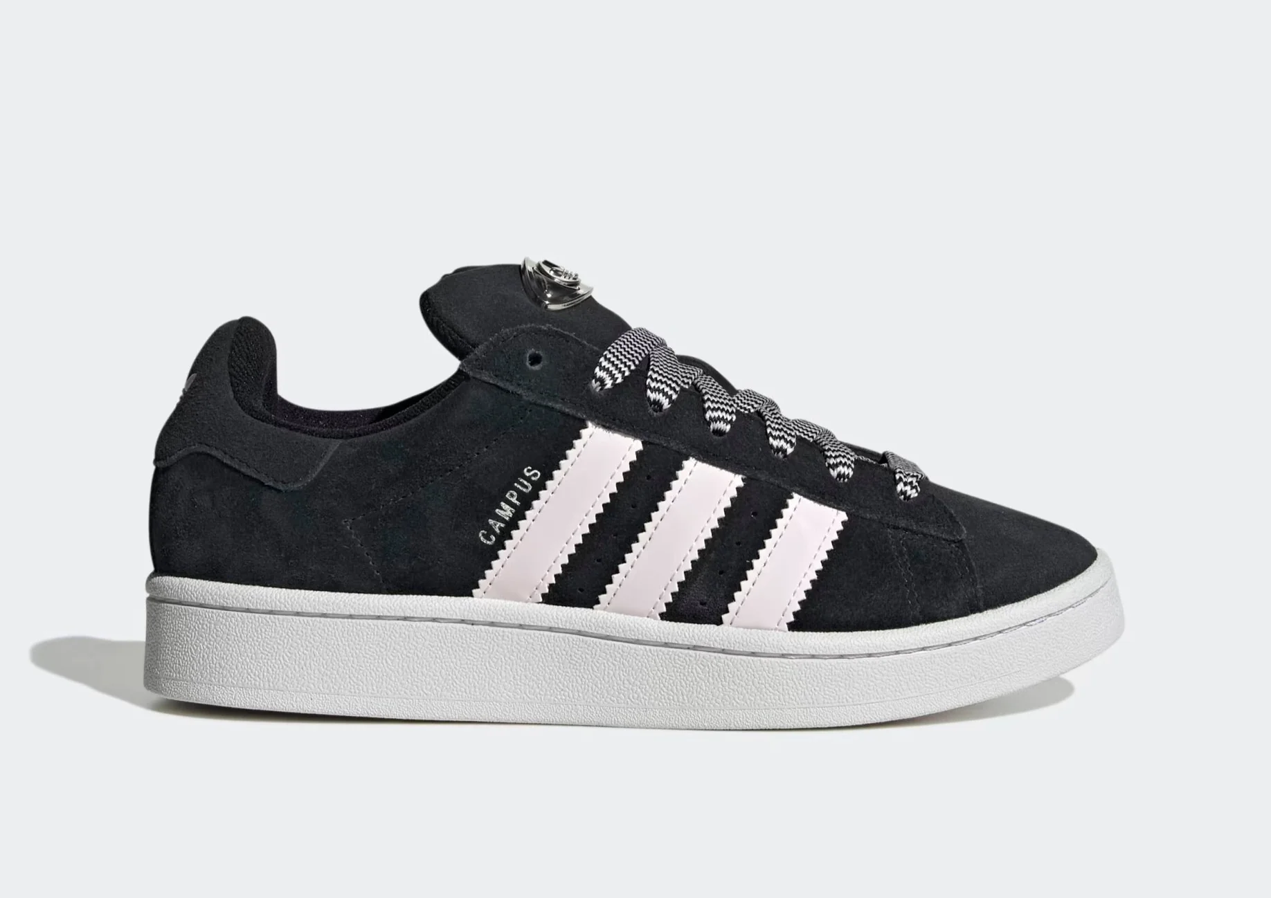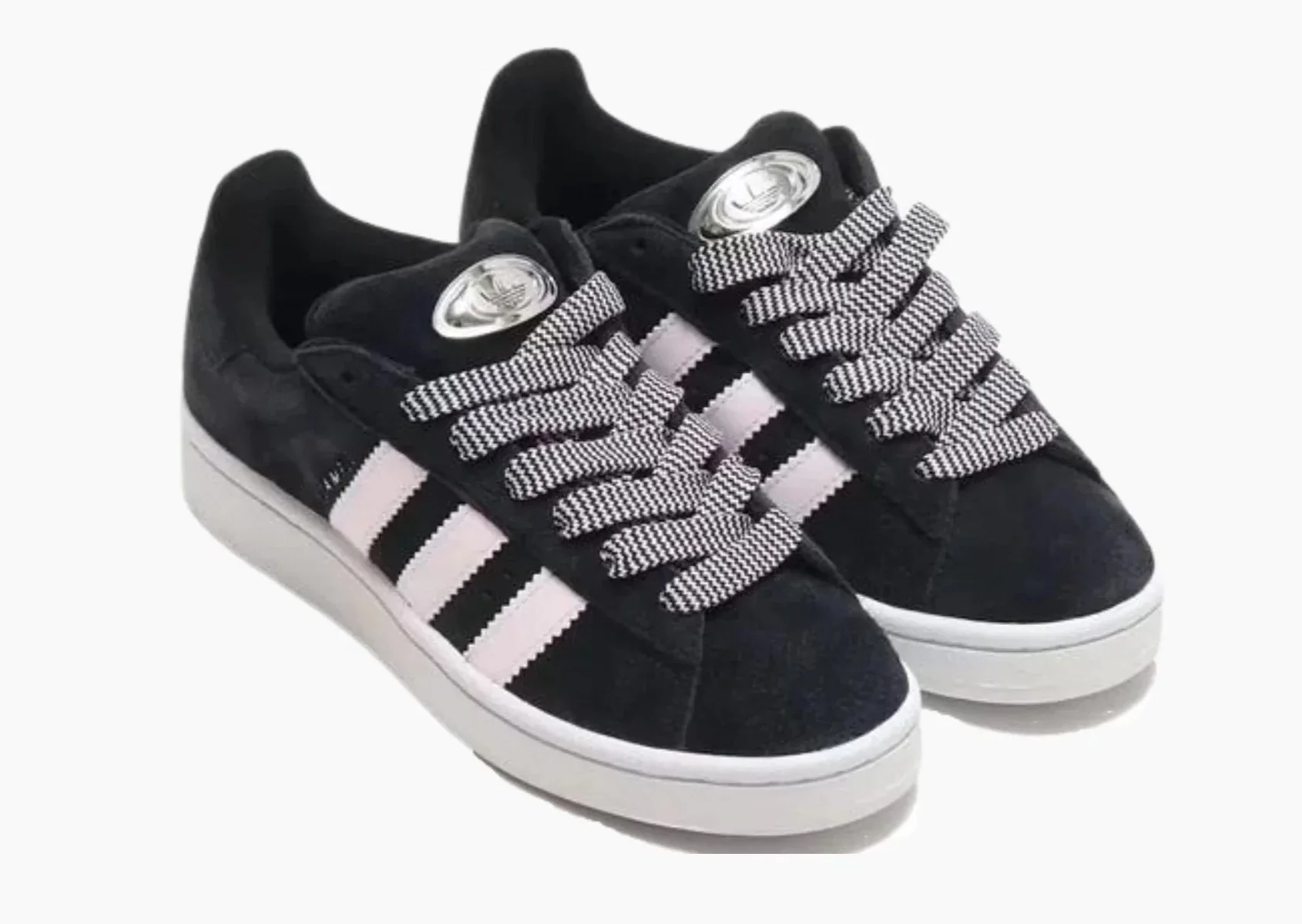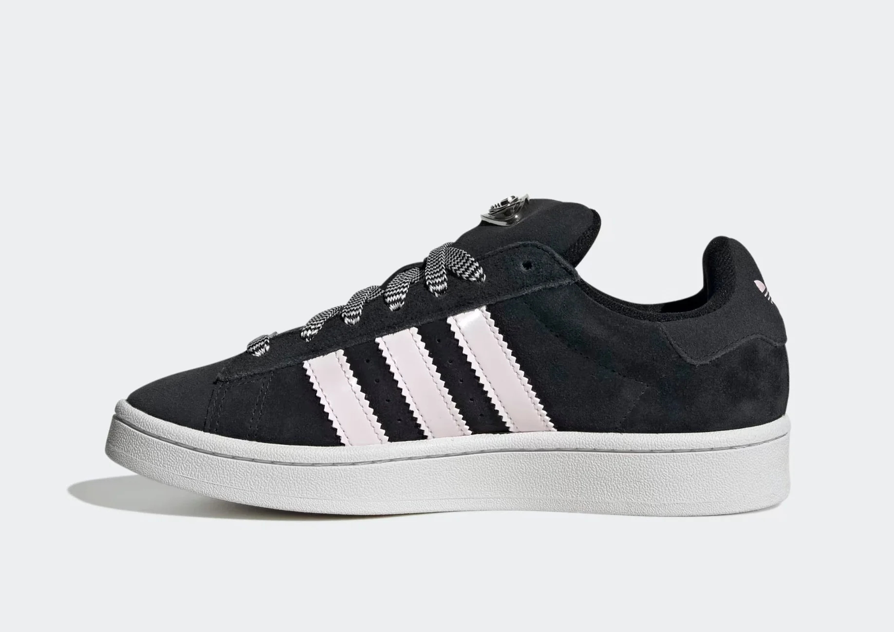 La Adidas Campus 00s Core Black Almost Pink se compose d’une empeigne en cuir noir, accentuée par les trois bandes distinctives rose pale sur le panneau latéral, emblématiques de la marque. Le heel tab en cuir noir offre une uniformité avec le reste de la chaussure.
