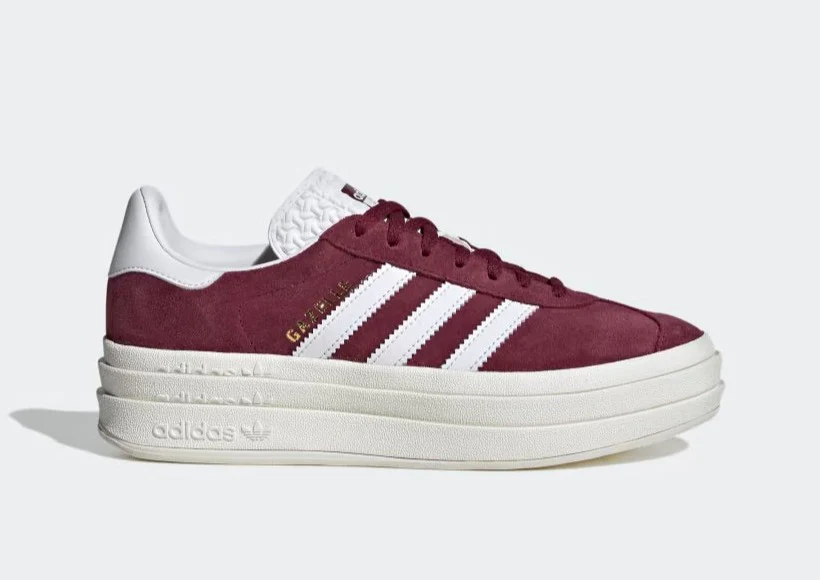 La adidas Gazelle Bold Shadow Red révèle une tige bordeaux, accompagnée de trois bandes en cuir blanche sur le talon et d’une étiquette de marque sur la langue. Son originalité réside dans sa semelle épaisse qui la distingue. La semelle traditionnelle est disponible en trois épaisseurs différentes. Le logo « Gazelle » doré sur le pan latéral ajoute la touche finale au design.