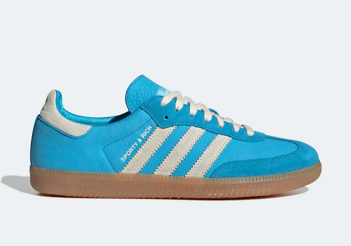 Dans leur deuxième partenariat, Emily et adidas ont choisi la Samba, en parfait accord avec l’esthétique rétro des années 90 souvent adoptée par Sporty & Rich. La chaussure présente une tige en cuir texturé d’un bleu vif, associée à des empiècements en daim ton-sur-ton. Des touches de gris et de beige se retrouvent sur les trois bandes, le talon et les lacets. Au niveau des détails, la mention habituelle « Samba » sur la partie supérieure est remplacée par « Sporty & Rich », et un co-branding est présent sur le talon, la semelle intérieure et la languette. Un tag perlé et doré est attaché aux œillets, et la chaussure est complétée par une semelle extérieure en gomme.
