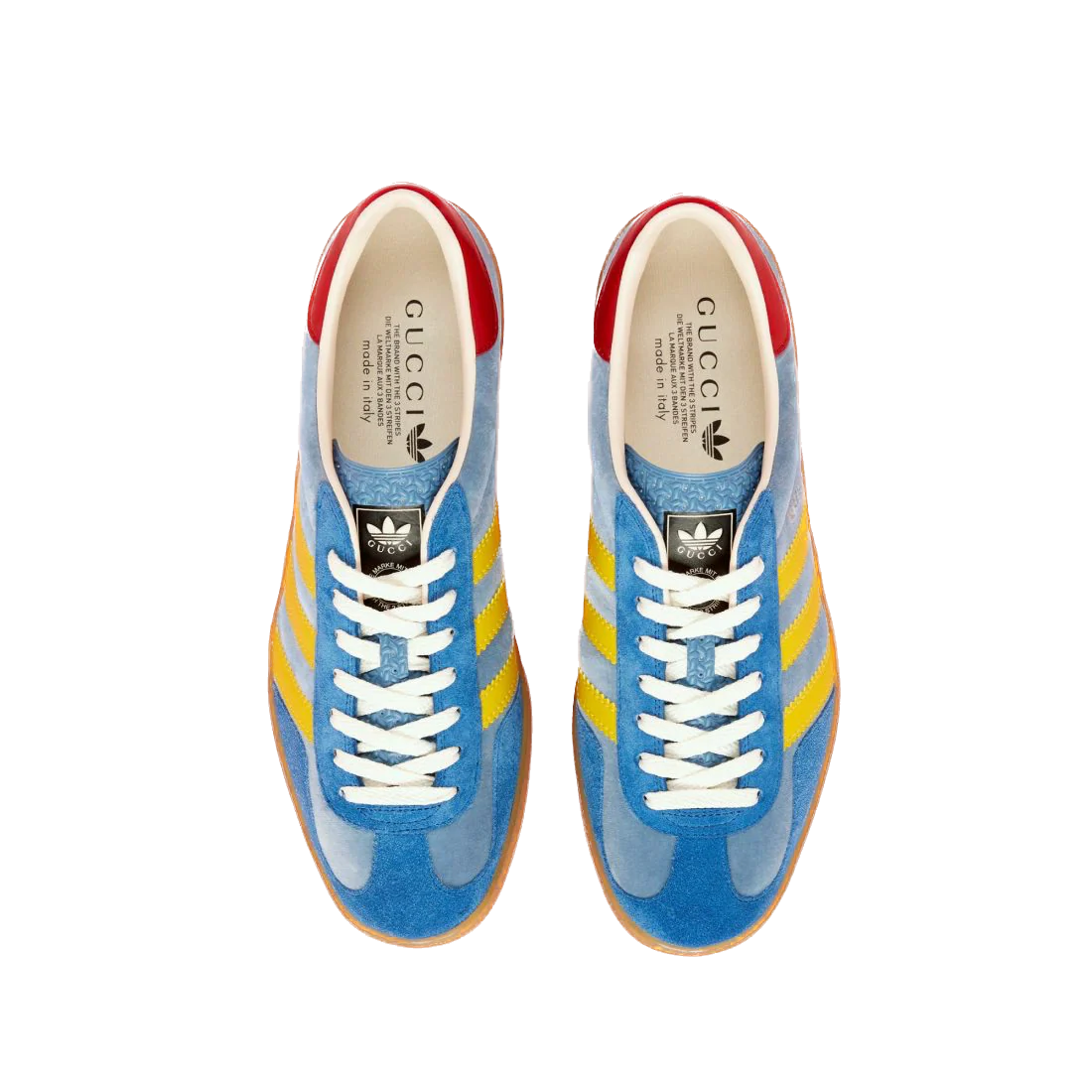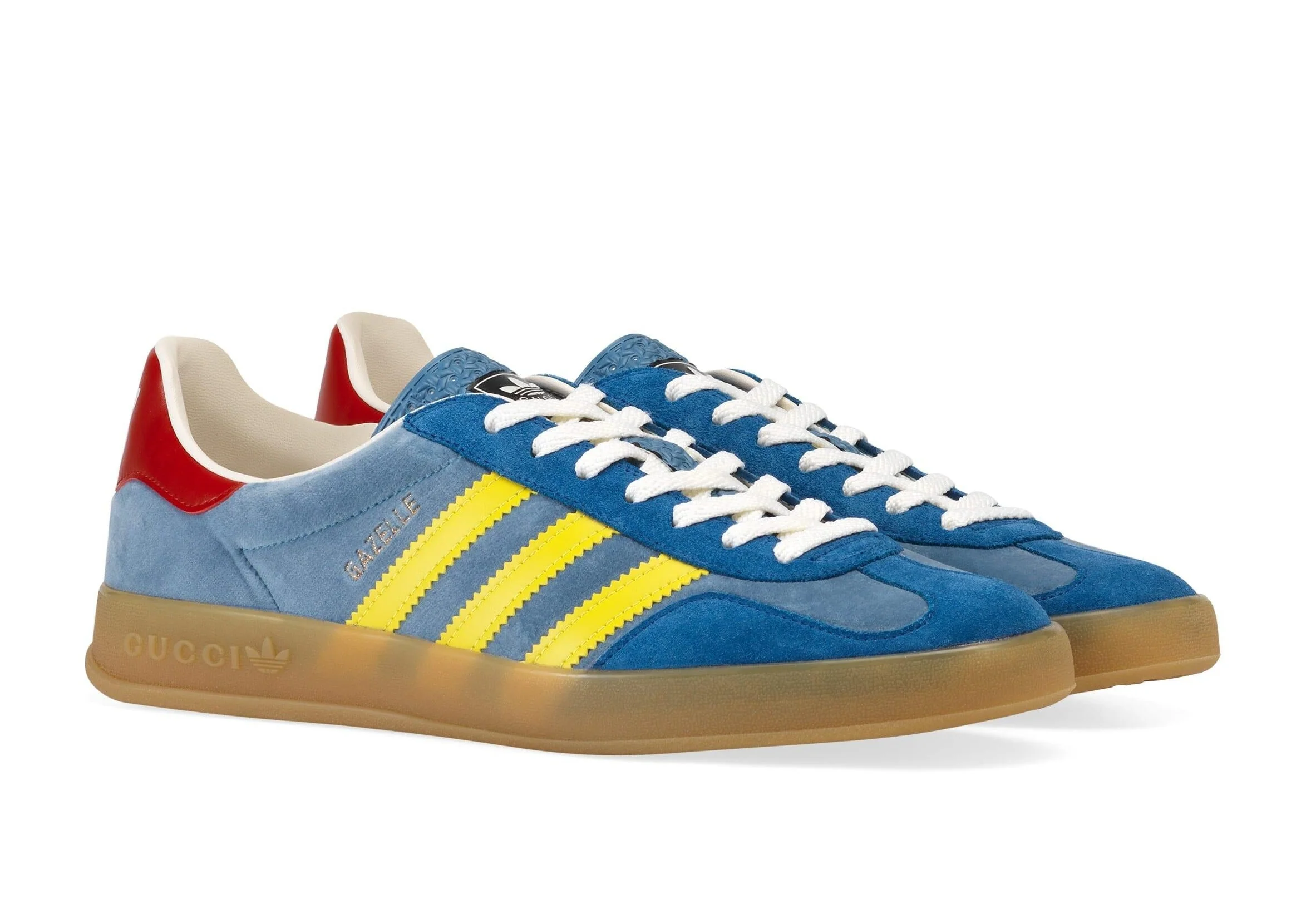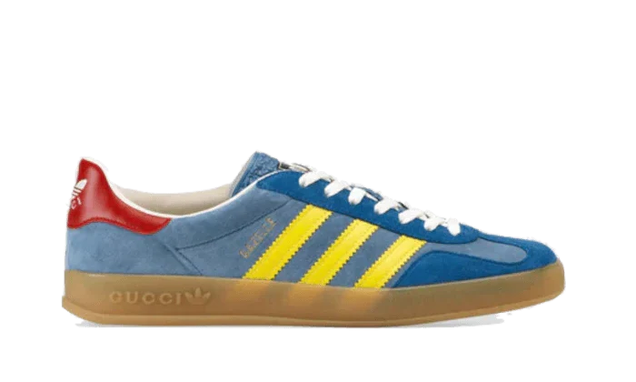La Adidas Gazelle Gucci Light Blue Yellow s’inspire des souvenirs des années 80 et 90 du directeur artistique de la maison italienne, Alessandro Michele. Fabriquée en Italie, cette paire associe du suède et du Demetra, une matière haut de gamme et respectueuse de l’environnement développée par Gucci. Les trois bandes jaunes apportent un contraste saisissant, tout comme la semelle en gomme texturée et le renfort en cuir rouge.