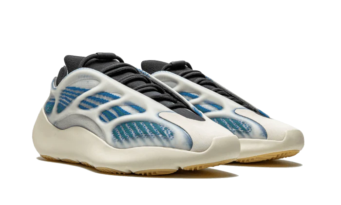 L’adidas Yeezy Boost 700 V3 « Kyanite » est une version de mars 2021 de la silhouette évolutive low-top de Kanye West. Se comparant favorablement à la version « Azareth » du même modèle, la « Kyanite » affiche également des stries bleues dans sa tige tricotée de manière complexe qui contrastent avec le tissu blanc et les superpositions RPU semi-translucides et phosphorescentes.