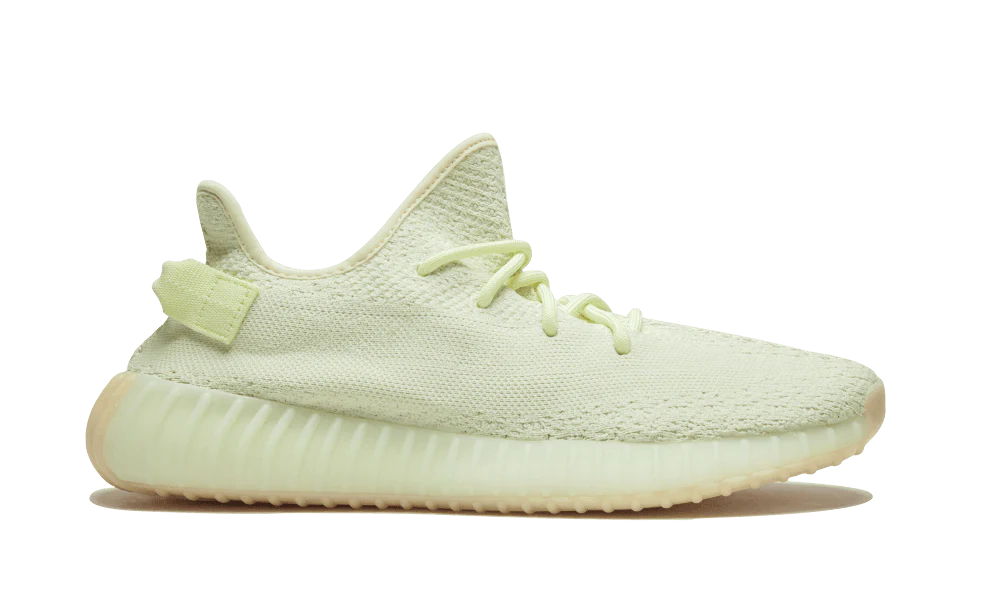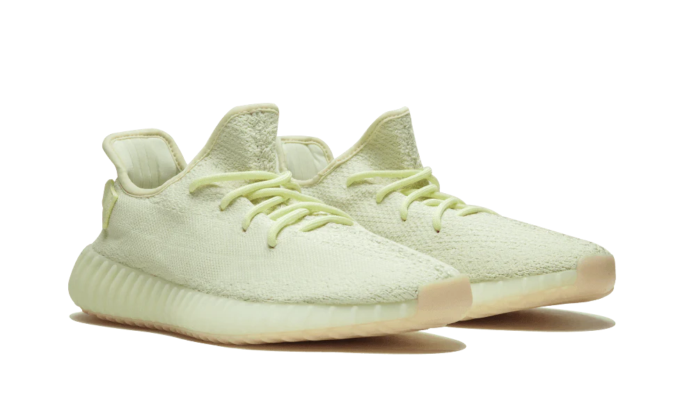 La adidas Yeezy Boost 350 V2 « Butter« , lancée à l’été 2018, justifie pleinement son nom en étant l’une des baskets les plus douces et élégantes de la collection. Dotée d’une tige Primeknit d’un jaune pâle subtil, cette version se distingue par son esthétique lumineuse et apaisante. La semelle intermédiaire semi-translucide, assortie à la couleur de la tige, crée une continuité visuelle fluide, tandis que la semelle extérieure présente une teinte légèrement plus foncée, ajoutant une dimension discrète au design.