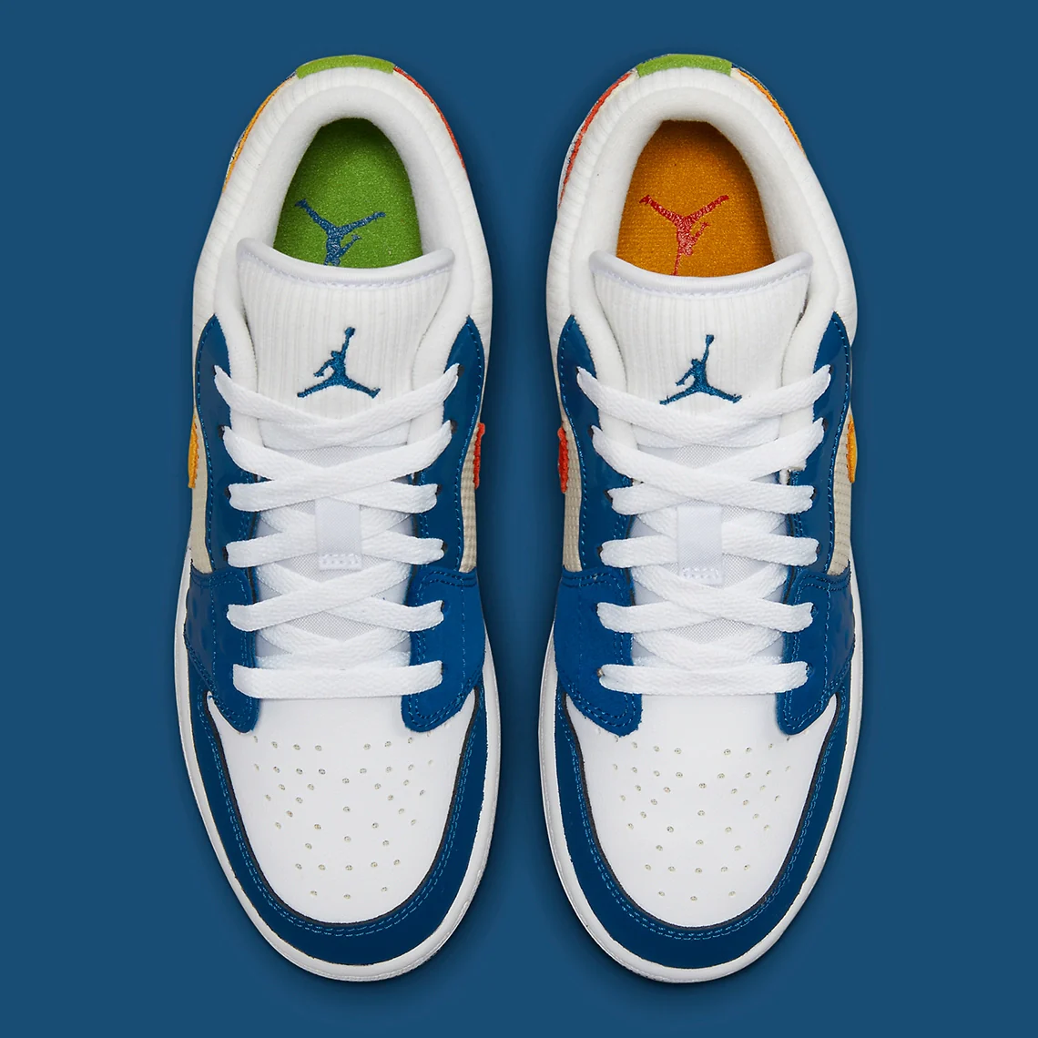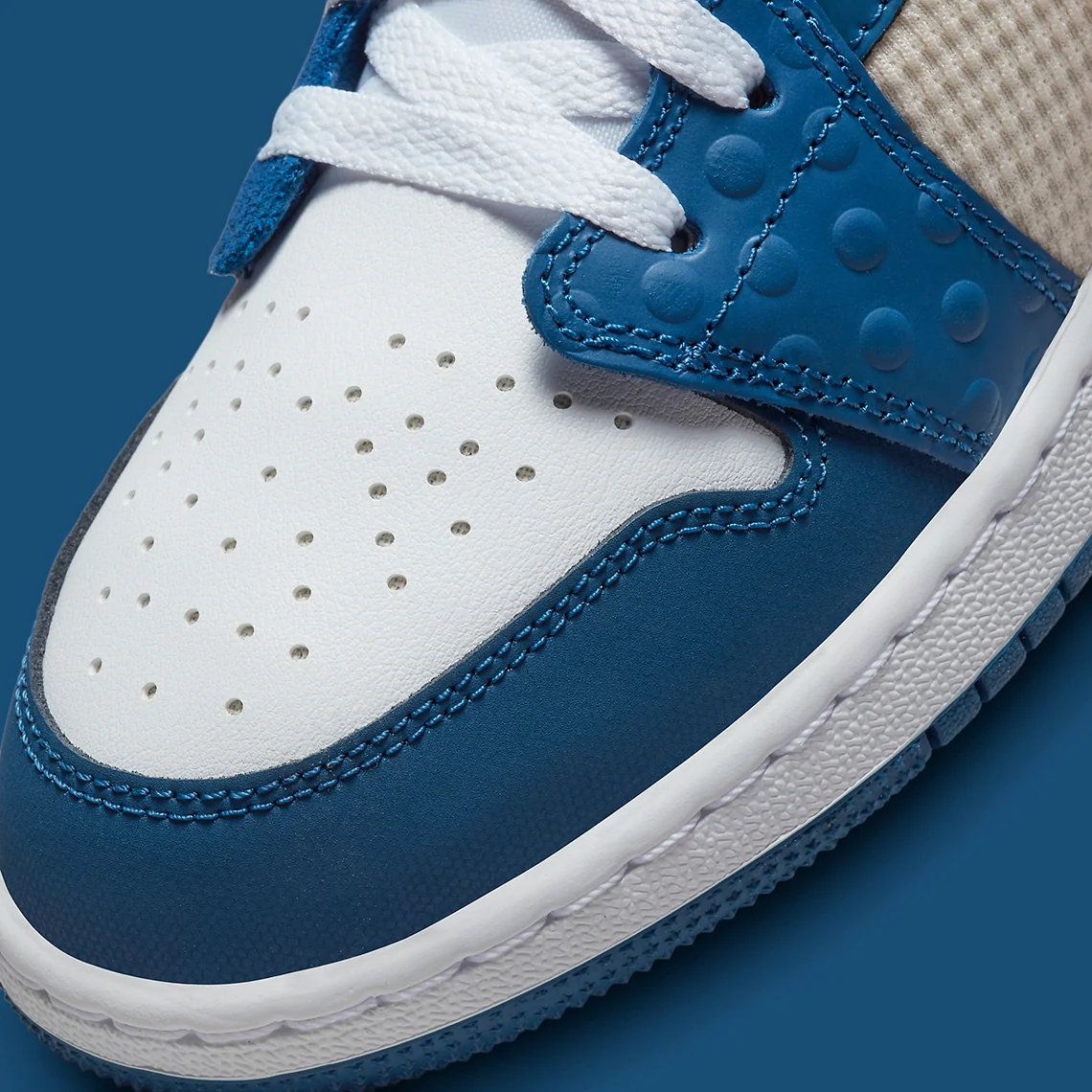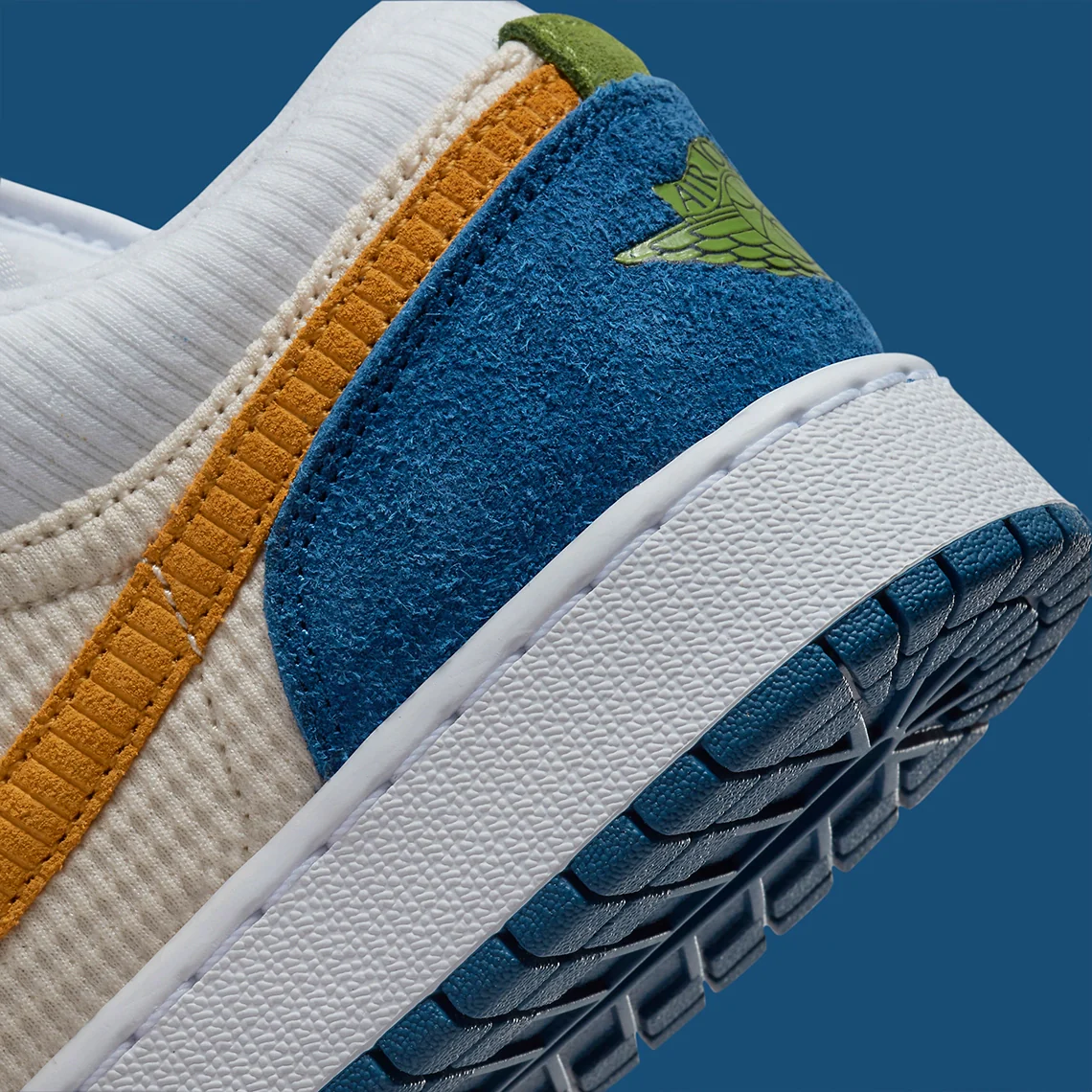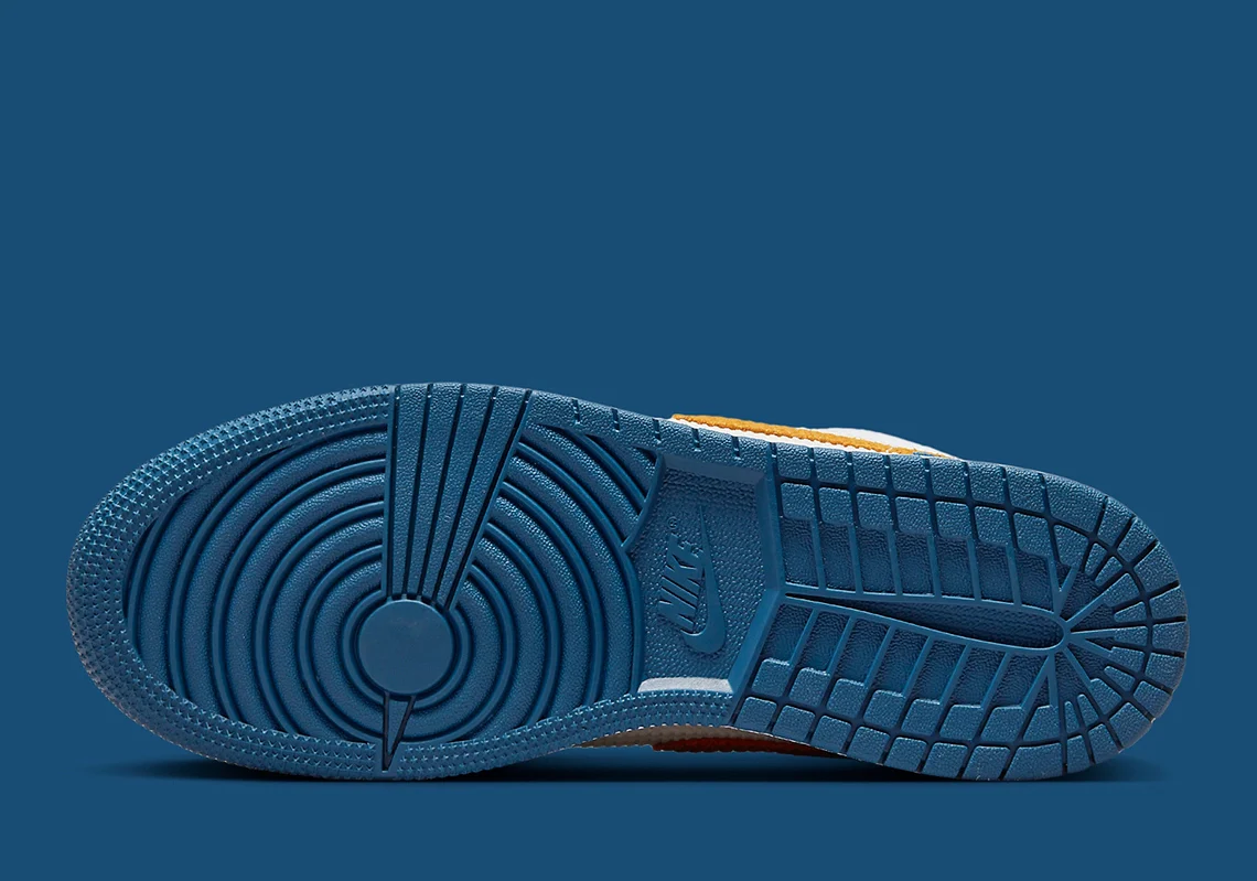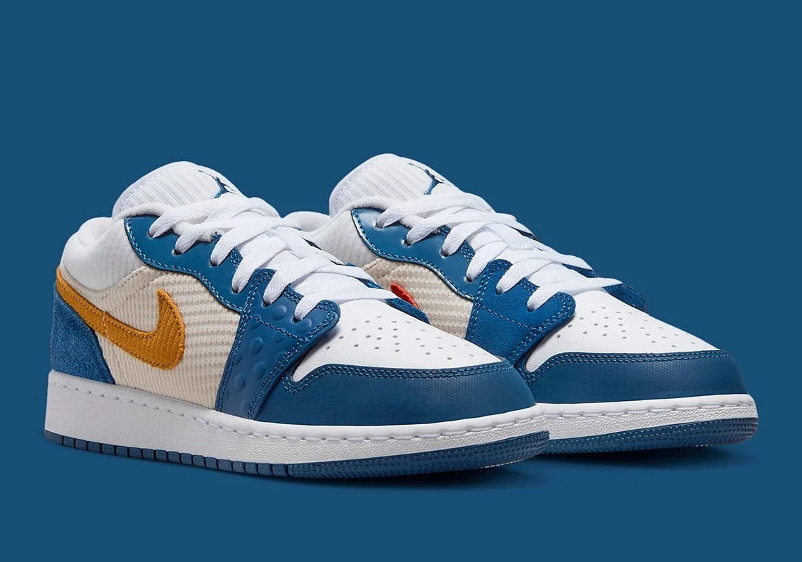 En juillet dernier, le Jumpman a habillé la Air Jordan 1 Mid d’une multitude de textures et de teintes différentes, créant ainsi un coloris ludique adapté à son jeune public. Et avec cette nouvelle Air Jordan 1 Low, la marque se répète à moitié, optant pour une construction similaire mais une palette beaucoup plus simple. L’essentiel de cette version exclusive pour les enfants est habillé de superpositions bleu profond, dont les matériaux vont du daim à poils longs au cuir à pois. Entre les deux, le blanc court sur toute la longueur de la chaussure, traversant une boîte à orteils relativement standard ainsi que des languettes et des cols faits de textile côtelé. Sur les côtés latéraux et médians, le panneau central présente un tissage blanc cassé, qui complète parfaitement les Swooshes qui alternent entre un rouge vif et un jaune sourd.