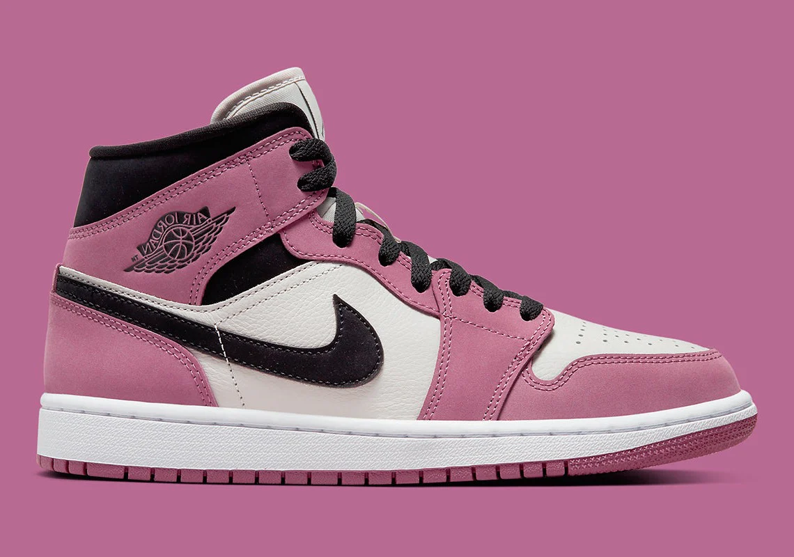 Probablement une version féminine, cette Air Jordan 1 Mid «Berry» remplace le rouge universitaire classique par une teinte rose / violette sur la zone des orteils, le panneau du quart, le col en dentelle, la cheville et le talon.