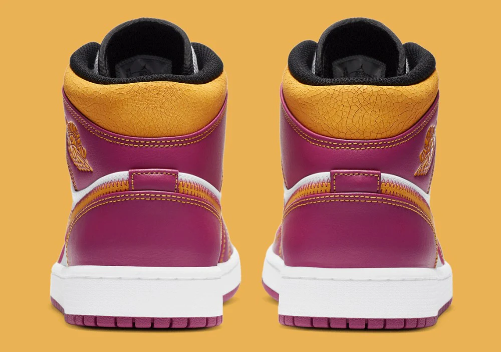 Du cuir blanc apparaît sur le bout perforé et le panneau médian. Jordan Brand contraste la base neutre avec des détails en cuir fuchsia sur l’avant-pied, les œillets, le col et le panneau central. Le Swoosh jaune craquelé et le col apportent une touche personnalisée. Le « Dia de los Muertos » présente une étiquette de languette en nylon doré inspirée de l’héritage et une broderie « Familia » sur l’avant-pied.