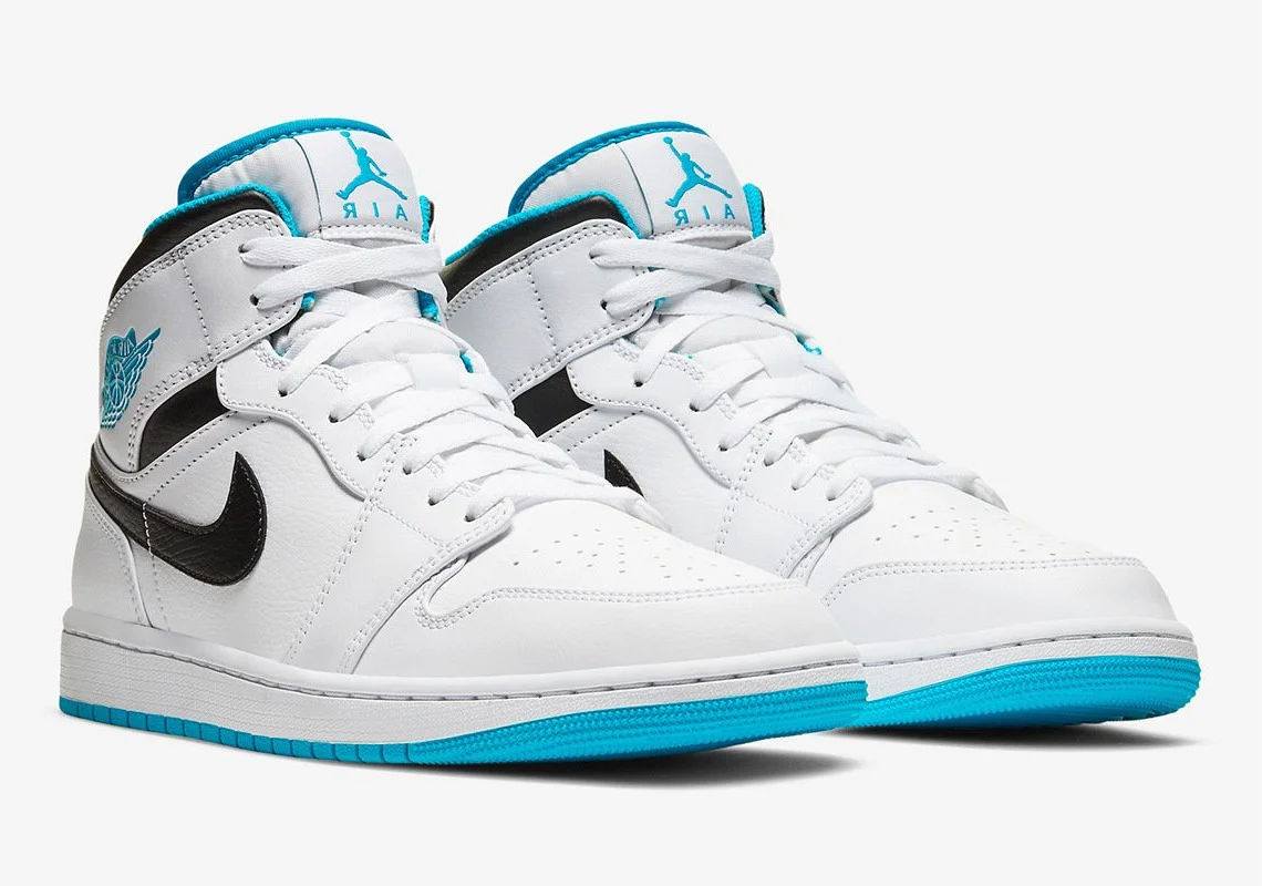 La Air Jordan 1 Mid « White/Laser Blue » est une autre version colorée de la chaussure de Michael Jordan dans sa version mi-haut de gamme. Bien que non officiel, le look « White/Laser Blue » pourrait être considéré comme un hommage à nul autre que les Charlotte Hornets, la franchise de la NBA appartenant à Jordan.