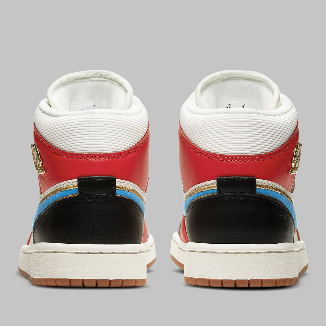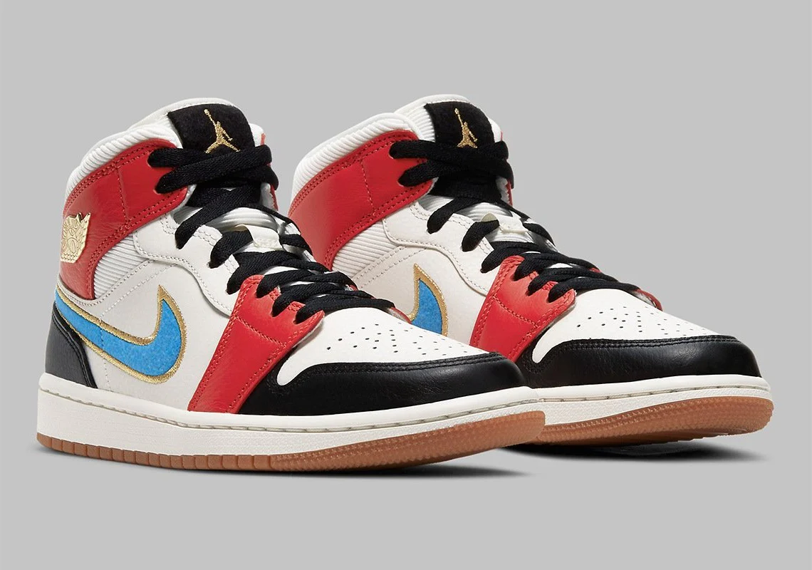 Sa base, qui agit comme une fondation pour les accents audacieux, s’habille entièrement dans la teinte Sail, le ton travaillé non seulement dans les cuirs lisses à l’avant du pied, mais aussi dans le velours côtelé à larges côtes qui meuble le col et la langue. Ailleurs, des superpositions rouges audacieuses sont associées, placées à côté des neutres noirs que l’on trouve sur les lacets, le patch de la marque, le bout du pied et le contrefort du talon. Les semelles en gomme complètent le tout, tandis que le swoosh teinté de bleu se termine par un fil doré comme celui de l’emblème Wings et de l’imprimé Jumpman.