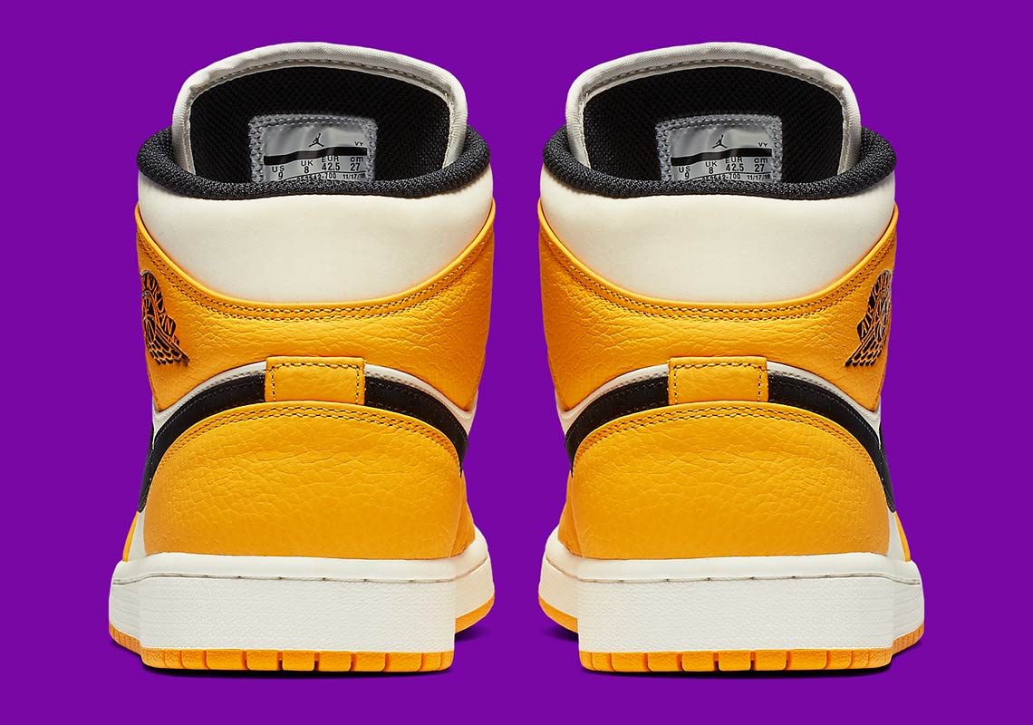 Conçue avec une tige en cuir premium, elle associe un blanc éclatant à des superpositions violettes et des détails jaune or qui rappellent directement le maillot des Lakers. Le logo Jumpman sur la languette et le Wings iconique sur le col soulignent l’authenticité de ce modèle.