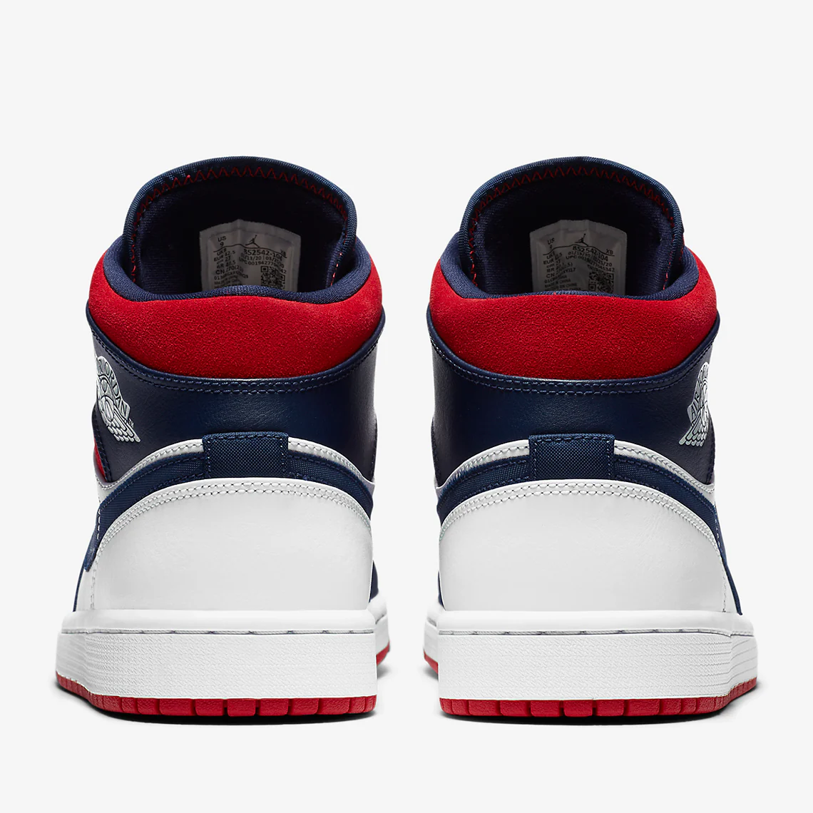 L’avant-pied, l’embout, les œillets et le col sont recouverts de nubuck bleu marine. La teinte réapparaît sur le Swoosh, au milieu du panneau. Un logo blanc « Wings » orne le col et le logo rouge de Jumpman recouvre la languette en nylon marine. En dessous, une semelle intermédiaire en caoutchouc blanc et une semelle rouge contrastante complètent le modèle « USA » Jordan 1 Mid.