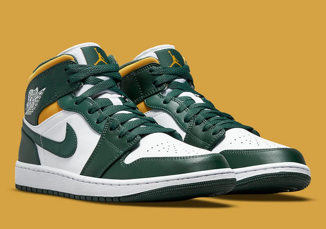 L’Air Jordan 1 Mid « Sonics » est un coloris de la première chaussure signature de Michael Jordan dans la silhouette mi-haute qui présente les anciennes couleurs de l’uniforme de l’équipe des Seattle Supersonics. Les Sonics, aujourd’hui disparus, qui ont déménagé pour devenir le Thunder d’Oklahoma City à la fin des années 2000, portaient des uniformes d’équipe verts et jaunes et figuraient parmi les équipes de basket-ball les plus populaires de la NBA à l’époque.