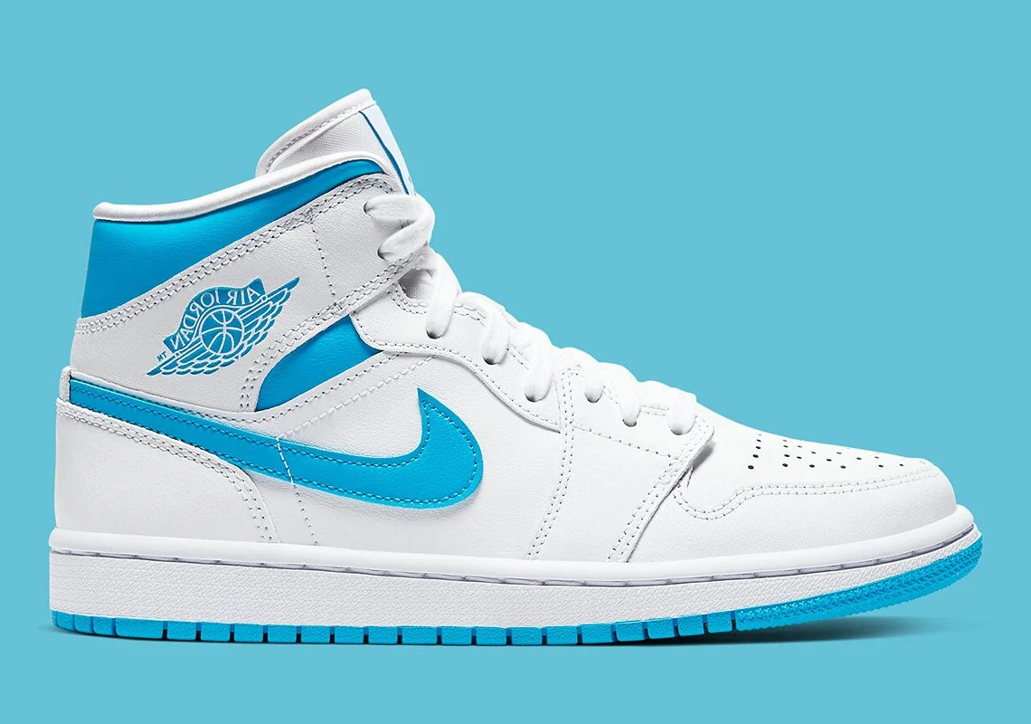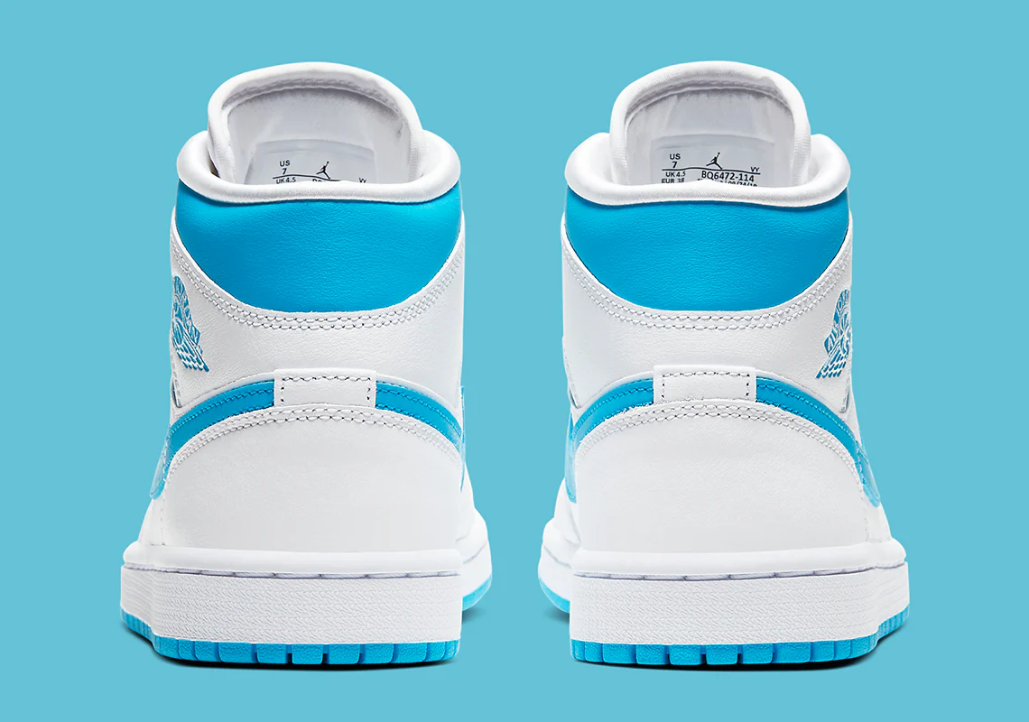 D’autres touches de Carolina Blue se retrouvent sur le logo Wings sur le col et sur la marque Jumpman sur la languette en nylon blanc. La marque Jordan opte pour une semelle intermédiaire blanche en caoutchouc toujours aussi élégante et une semelle extérieure bleu clair contrastée pour parfaire le style de la chaussure. La Air Jordan 1 Mid « UNC » est sortie le 14 janvier 2020.