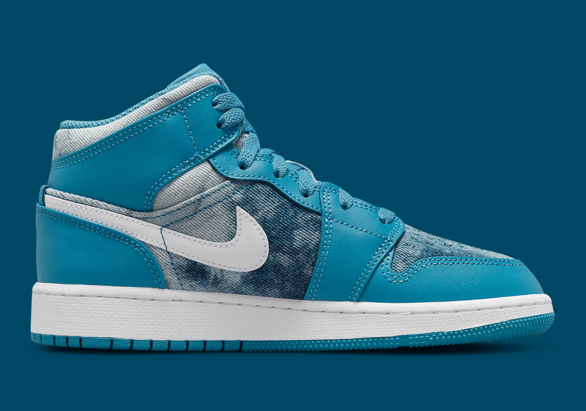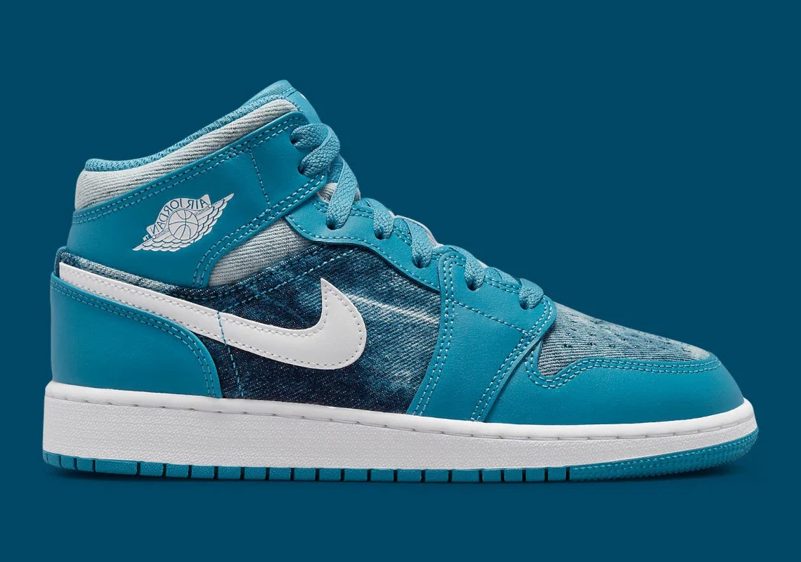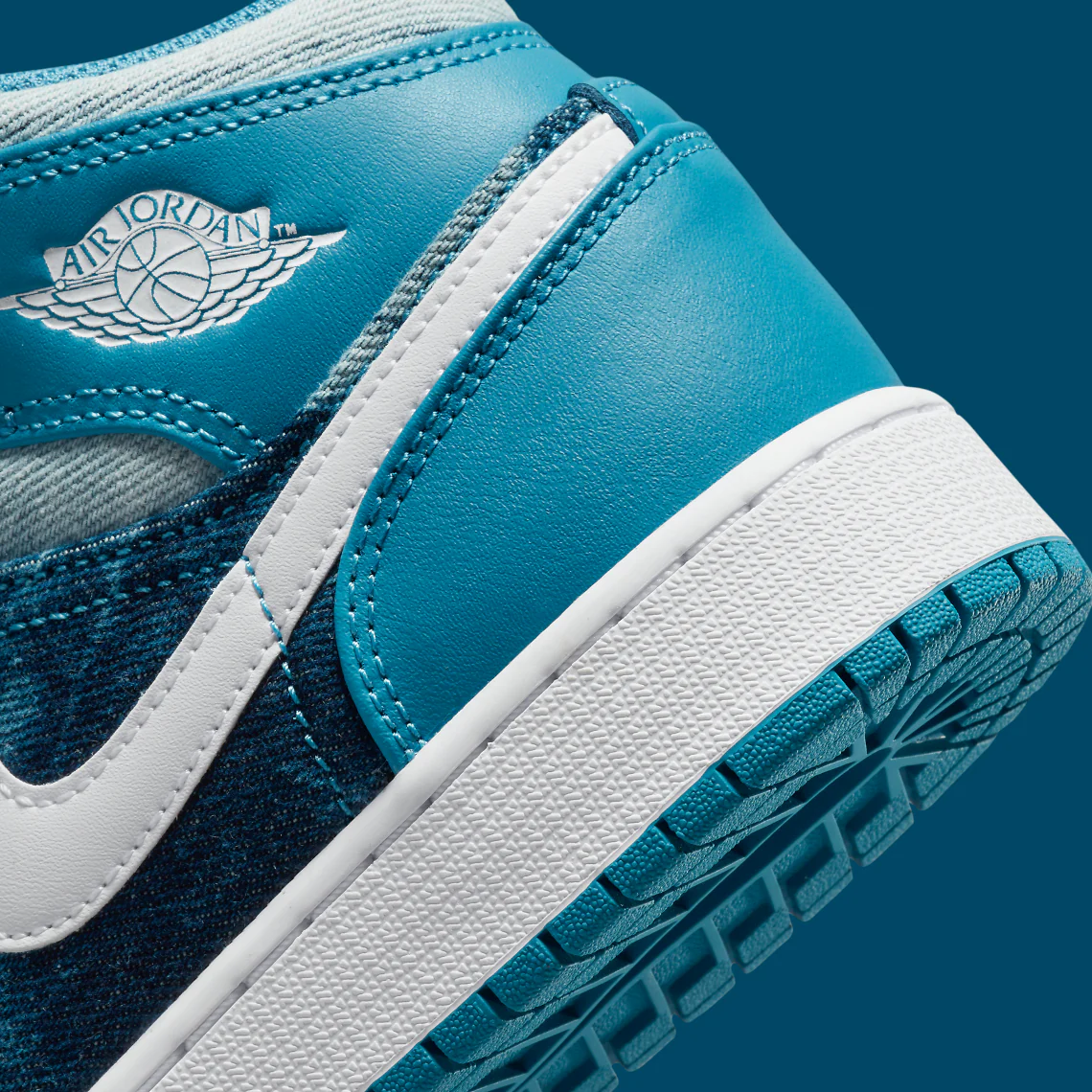 La Air Jordan 1 Mid GS « Washed Denim »est un dérivé de la mythique Jordan 1 dans un coloris denim audacieux. Cette basket abandonne la base en cuir habituelle pour un motif denim délavé. Le denim est présent sur la tige avec des superpositions de cuir bleu universitaire sur toute la chaussure. Le Swoosh, le logo Wings sur le panneau de la cheville et le Jumpman sur la languette ajoutent un contraste en blanc, que l’on retrouve également sur la semelle intermédiaire en caoutchouc sous le pied. Une tirette est ajoutée à la basket sur le talon pour un accès facile pour les enfants. Une semelle extérieure bleue complète la Jordan 1 Mid.