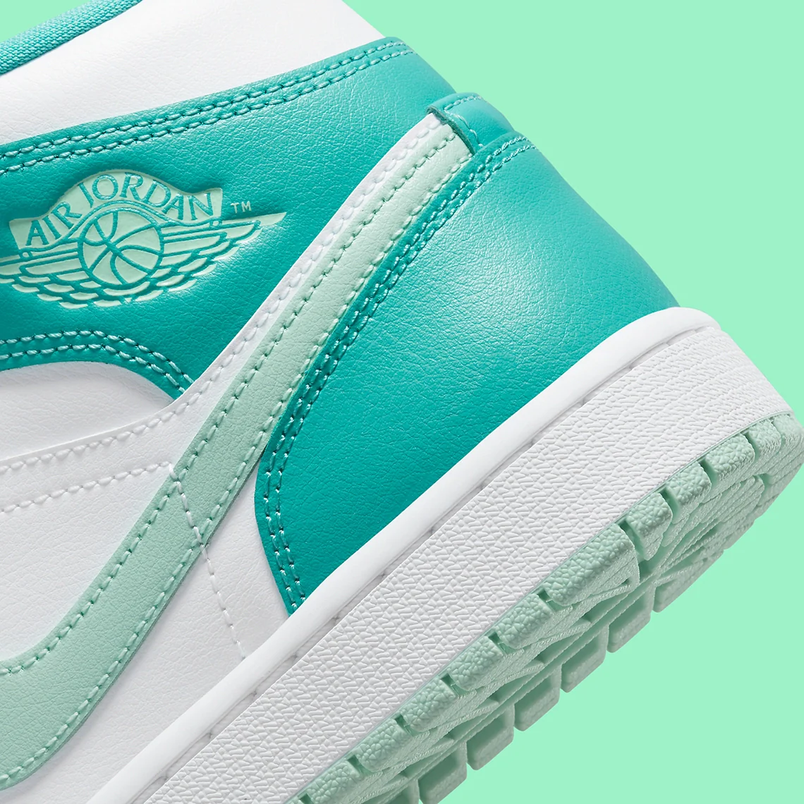 La Air Jordan 1 Mid Island Green ou Washed Teal se pare d’un insulaire vert vibrant, complétant les touches plus légères et rappelant la menthe à la fois sur le Swoosh et la semelle extérieure. Enfin, des neutres blancs sont posés en dessous ainsi qu’à côté, équilibrant les ajouts plus colorés via la base, la semelle intermédiaire et l’unité de dentelle.