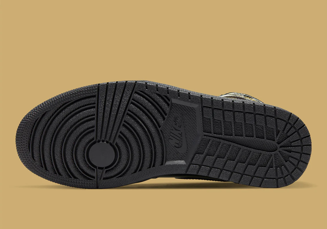 Le look rappelle celui de la Jordan 1 Mid de 2003, qui présentait la même tige en cuir noir avec un accent or métallisé. Comme cette version, le look moderne présente un Swoosh en cuir doré de chaque côté et un emblème « Wings » doré sur le col. D’autres détails Metallic Gold apparaissent sous la superposition du col et sur l’insigne « Nike Air » sur la languette en nylon noir. Une semelle en caoutchouc noir met la touche finale à la brillante Jordan 1 High « Black/Metallic Gold ». Date de sortie : 30 novembre 2020.