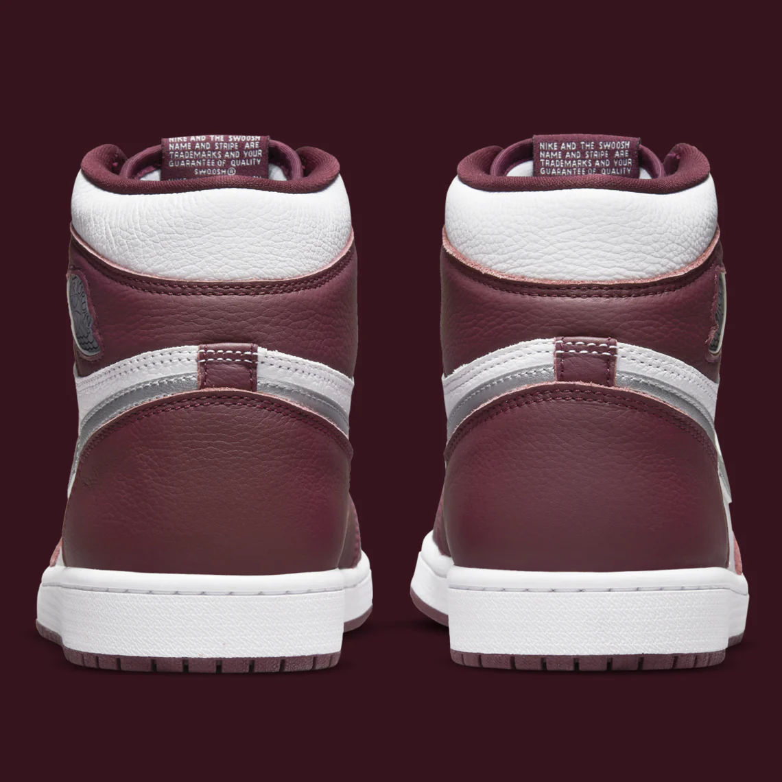 Plus précisément, le bout perforé, le panneau central et le col sont conçus en cuir blanc foulé. On retrouve du cuir bordeaux bordeaux contrasté sur l’avant-pied, les œillets, le col et le talon. Un Swoosh en cuir argenté métallisé orne les deux côtés de la chaussure et un logo « Wings » argenté est situé sur le col. La marque « Nike Air » blanche classique est imprimée sur l’étiquette de languette en nylon bordeaux sur le dessus de la languette en nylon blanc.