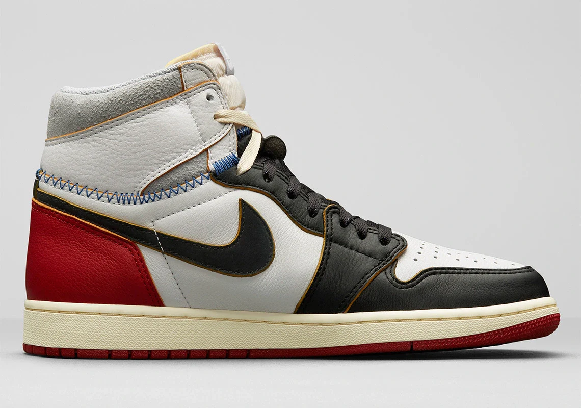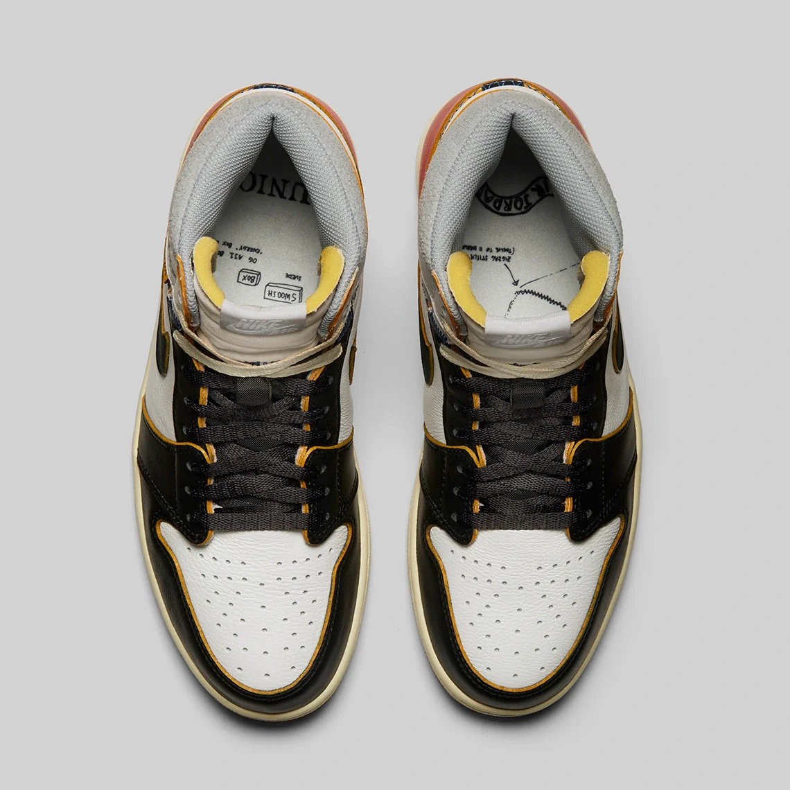La construction a également un aspect vintage avec du cuir jauni, de la mousse visible sur la langue et un traitement de détresse du cuir sur les panneaux de la cheville. Une étiquette « UN/LA » est appliquée à chaque cheville pour compléter ce design très convoité. L’Union x Air Jordan 1 « Black Toe » a été mis sur le marché en quantités extrêmement limitées en novembre 2018.
