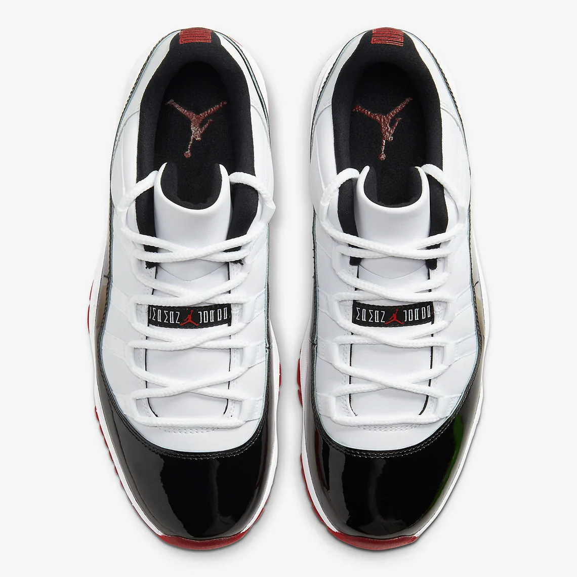 Le cuir blanc recouvre le milieu du panneau et le col, ce qui fait que la couleur rappelle celle de l’édition emblématique « Concord ». La semelle intermédiaire blanche est mise en contraste avec une semelle extérieure semi-translucide de couleur rouge universitaire qui se combine avec le cuir verni noir et la semelle intermédiaire blanche pour rappeler la « Bred » Jordan 11.