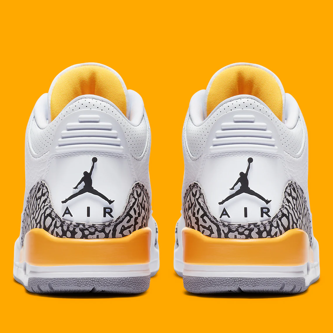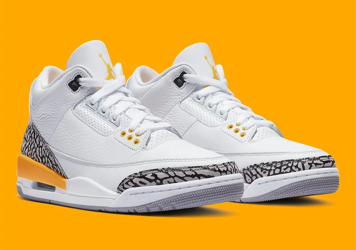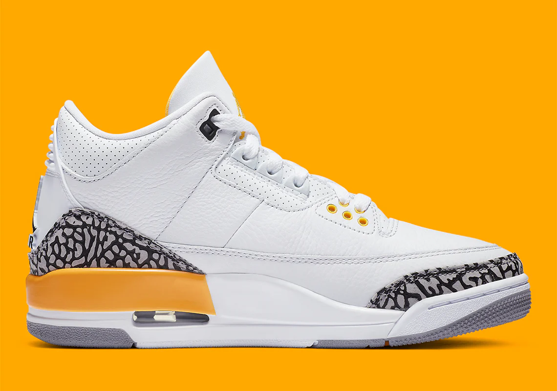 L’empreinte de l’éléphant est intégrée au design, apparaissant sur le talon et la pointe pour un look intemporel. La teinte orange laser entre également en jeu sur les œillets, le sockliner, la broderie Jumpman sur la langue et la semelle intermédiaire. Une fenêtre transparente dans le talon complète l’allure de cette Jordan 3 très recherchée. Date de sortie : 21 août 2020.