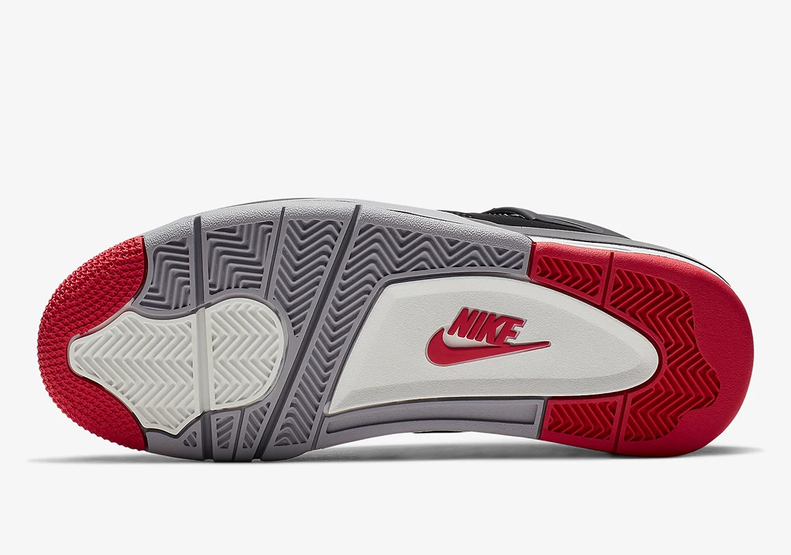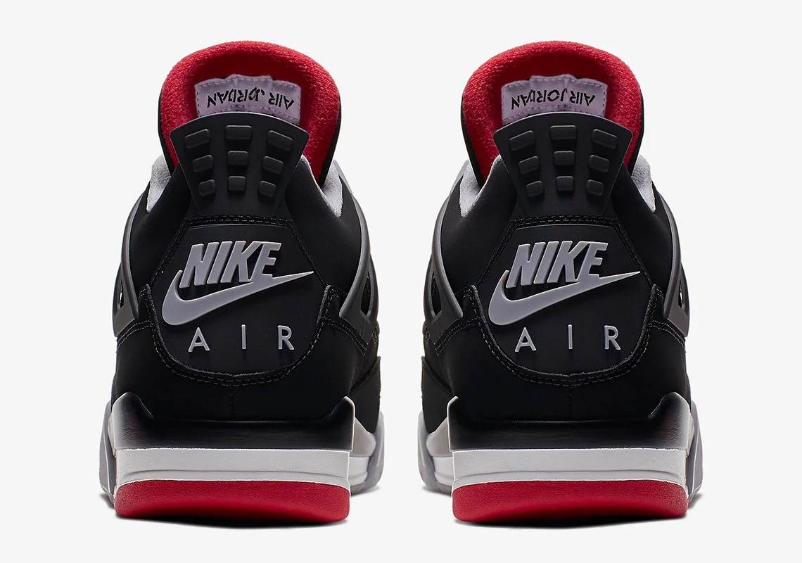 Ce modèle rétro fidèle à l’esprit de l’époque présente une tige noire en Durabuck (nubuck synthétique) avec des accents gris, rouges et blancs. En plus du grand logo Nike Air sur la patte du talon, la marque Nike originale est également présente sur la semelle extérieure et la doublure. La Air Jordan 4 « Bred » est sortie le 4 mai 2019.