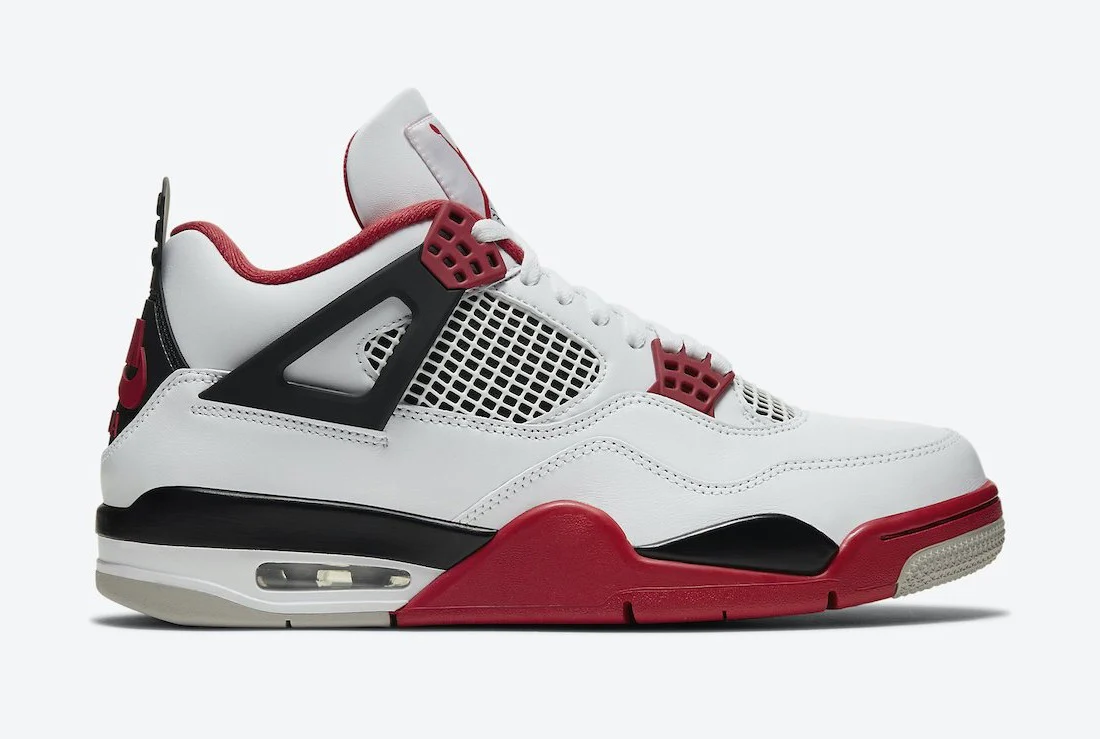 La tige est en cuir blanc lisse sur le bout, le col et le talon. Un filet blanc est présent à la fois sur la gorge et au milieu de la chaussure. Les oeillets, le liner et la semelle extérieure sont en rouge feu en hommage à l’aspect original. La marque se présente sous la forme d’un Jumpman rouge sur la languette et du logo rouge « Nike Air » à l’arrière de la chaussure. Un garde-boue noir et une semelle intermédiaire blanche avec une unité Air visible dans le talon apportent la touche finale à ce look intemporel pour la Jordan 4. Date de sortie : 28 novembre 2020.