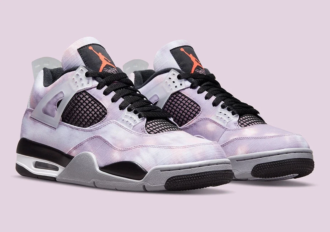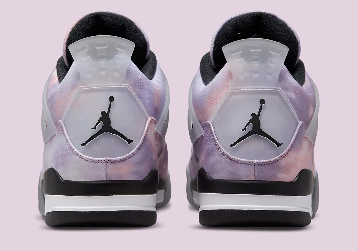 Le coloris est une explosion visuelle : un tie-dye violet, rose et bleu, contrasté par des touches de noir profond sur la cage et les œillets. La retro Nike 4 Zen Master mélange toile transparente et empiècements en TPU pour un rendu aussi moderne que spirituel.