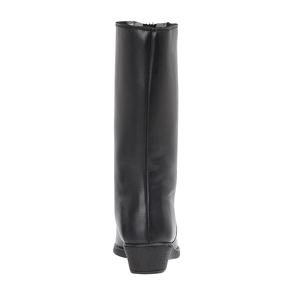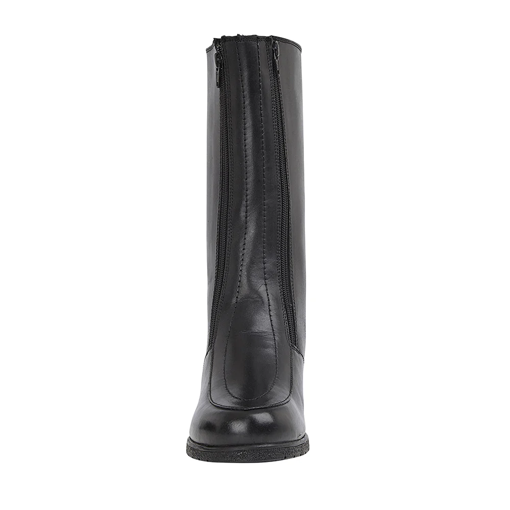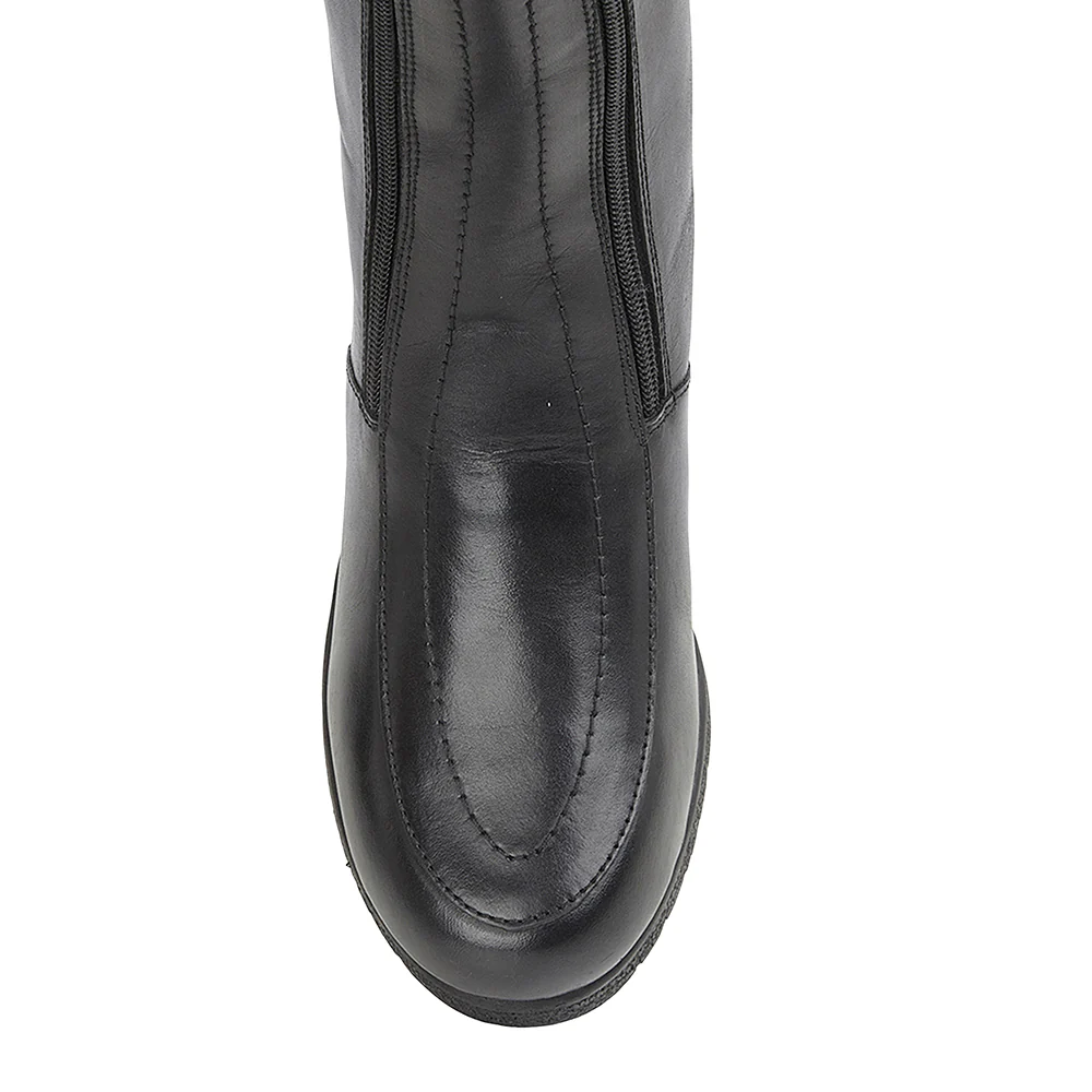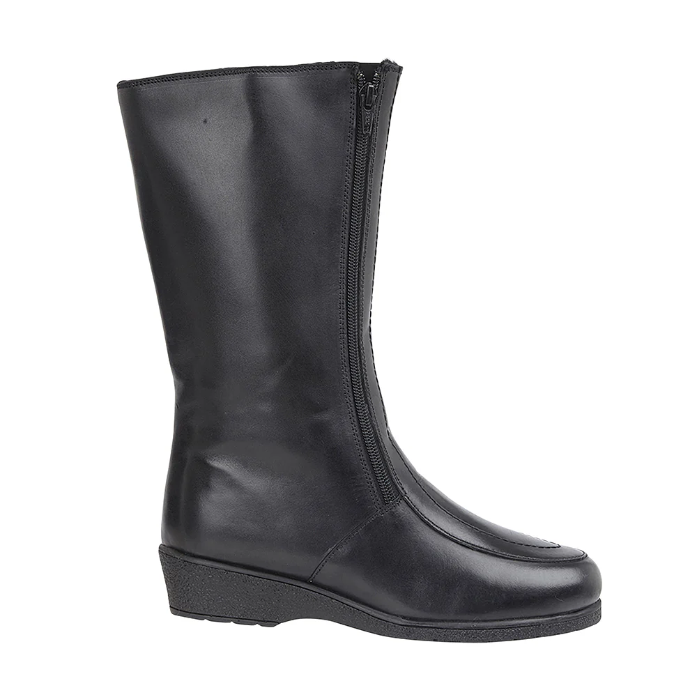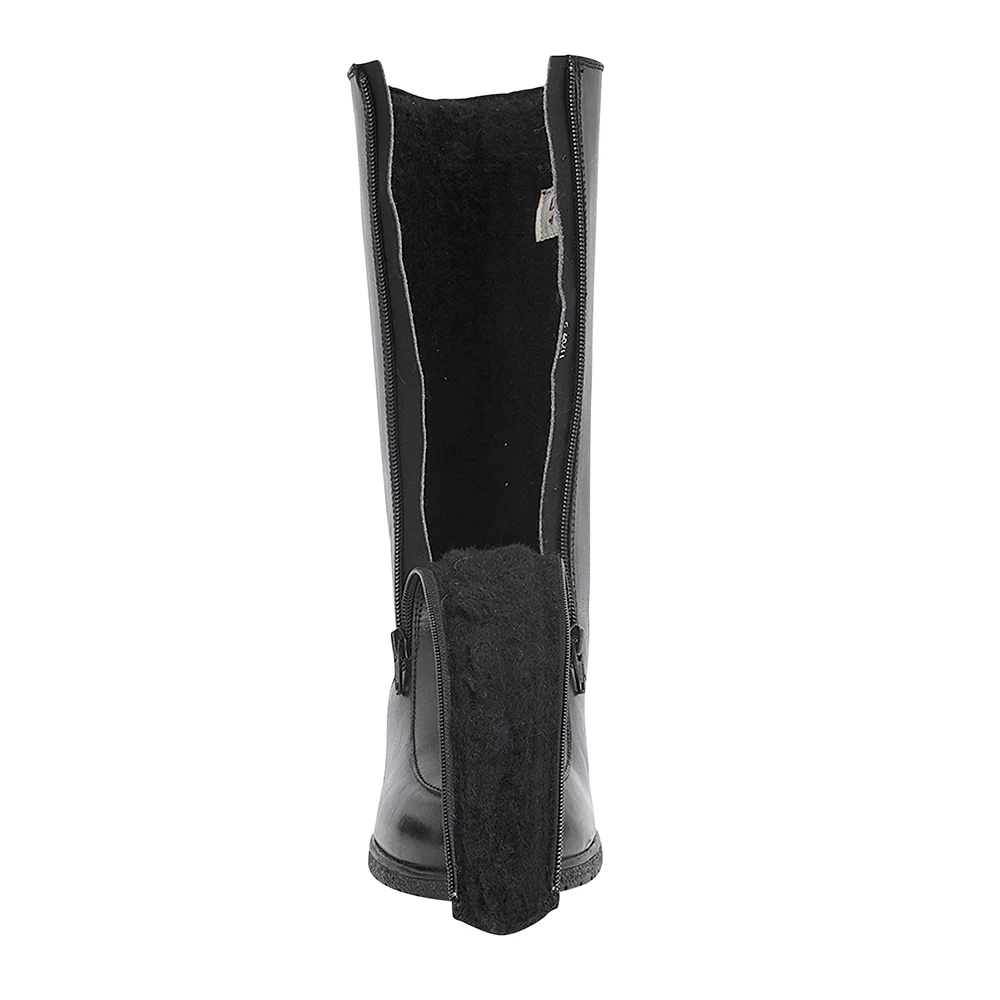 New and improved with a real sheepskin lining. The leather version of our traditional twin-zip rubber sole ladies boots for easy fitting. These handmade sheepskin ladies boots have leather uppers and 100% sheepskin lining, non-slip rubber soles with 1½ inch heels. The leg height is 11 inches. E fitting (wide). The top of leg circumference is 16 inches.