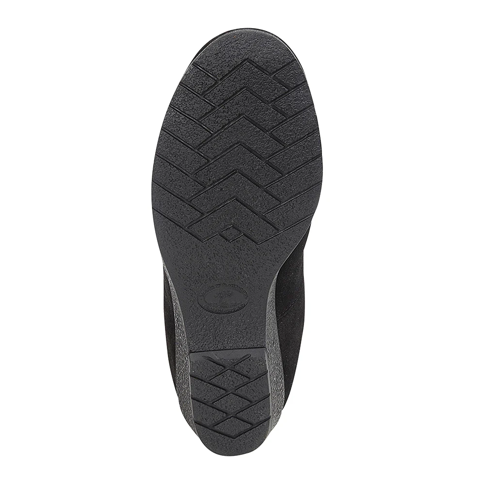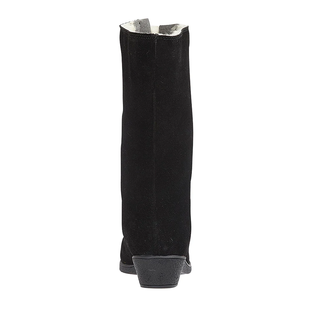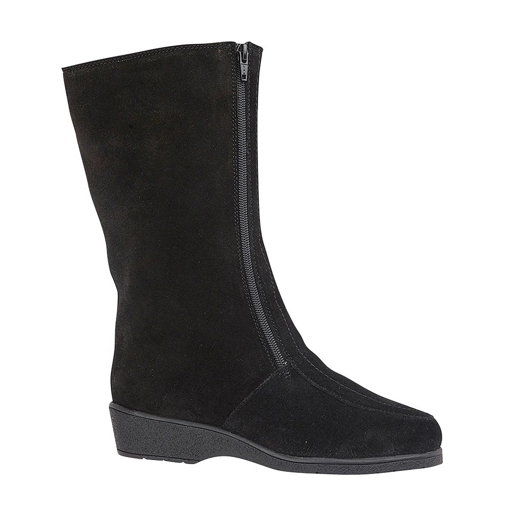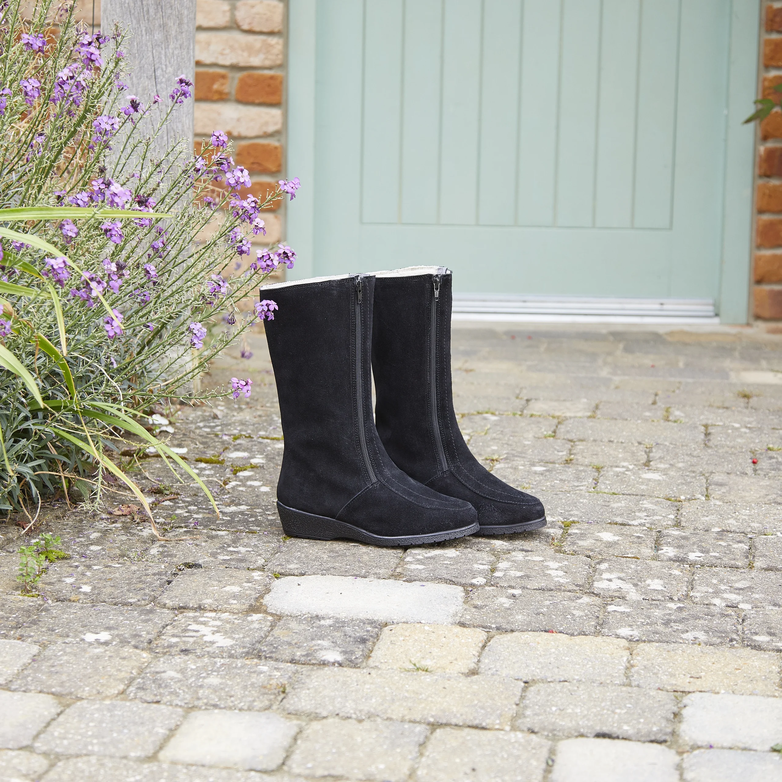 1½ inch heels, and leg height of 11 inches. Made with water-resistant suede. E Fitting (Wide). Top of leg circumference: 16 inches.