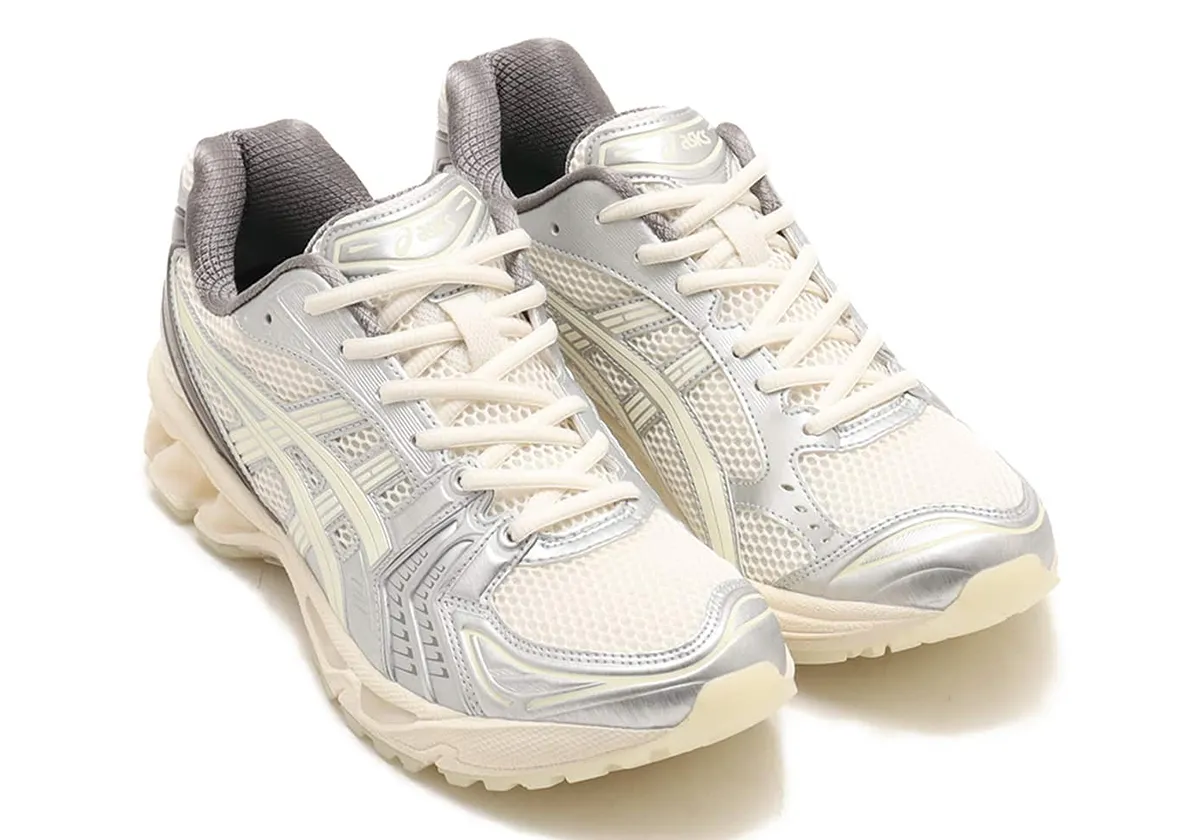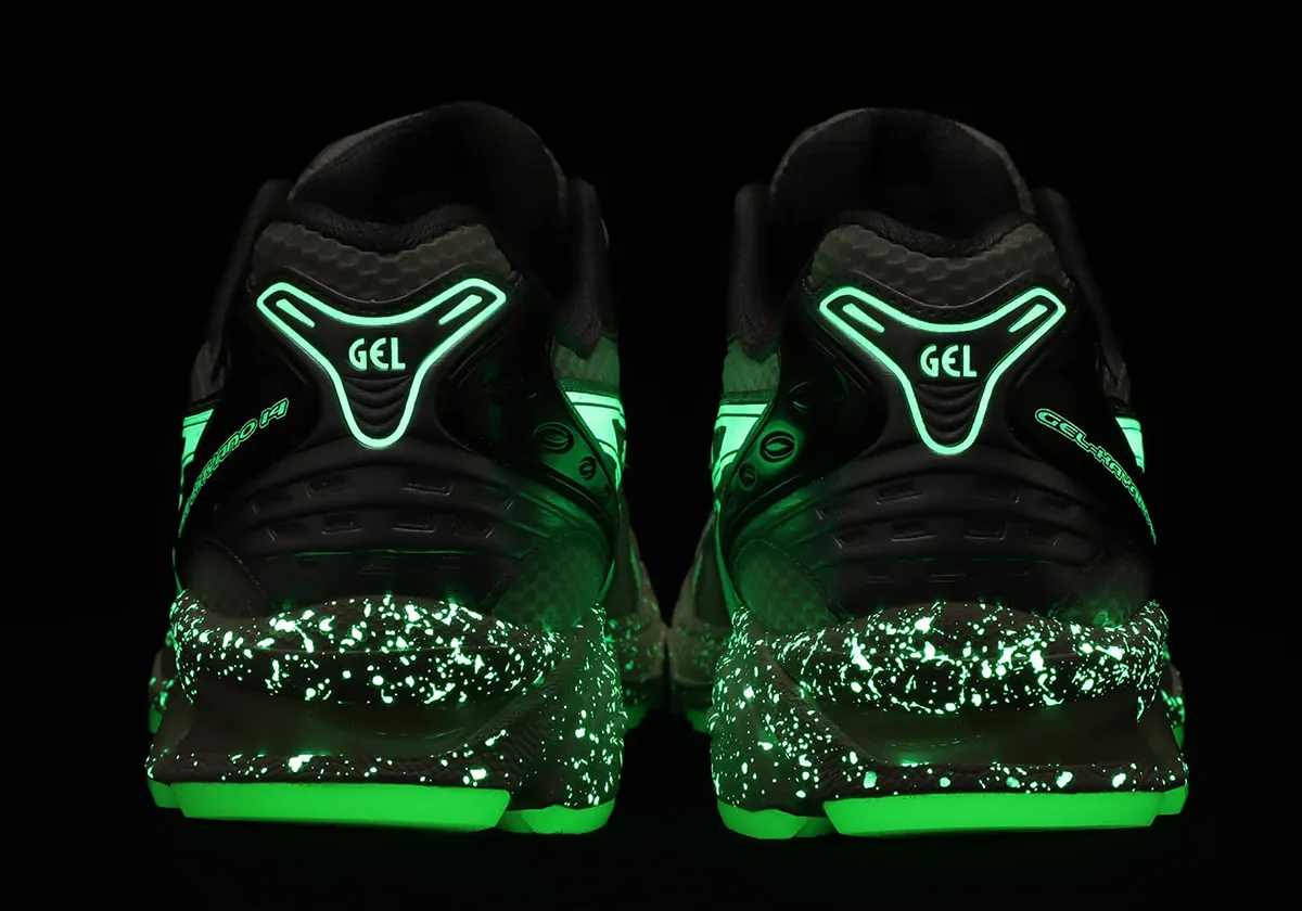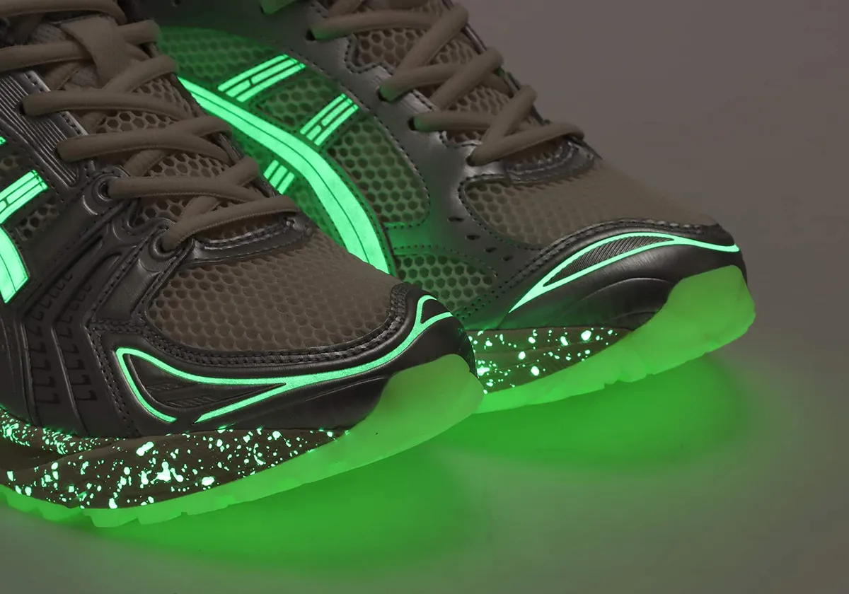 Dans cette version “Yakoutake”, la silhouette GEL-Kayano 14 se pare d’une tige majoritairement crème claire, agrémentée de détails vert pâle/sifflet « Whisper Green » et de renforts subtils dans des tons naturels rappelant le sol forestier. Le véritable atout : des éléments glow-in-the-dark (brillants dans l’obscurité) sur la semelle, la bande latérale et le motif intérieur pour évoquer la phosphorescence du champignon.