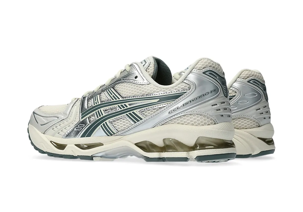 La paire arbore une tige en mesh respirant coloris Birch (beige naturel), sublimée par des superpositions métalliques Dark Pewter qui apportent profondeur et contraste. Ce mélange subtil de tons neutres et sombres souligne les lignes dynamiques de la Gel-Kayano 14 et lui confère une allure sophistiquée et intemporelle.