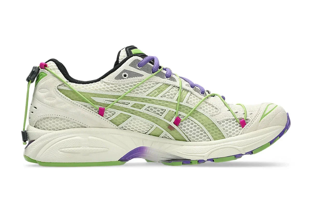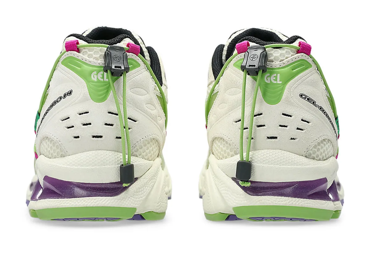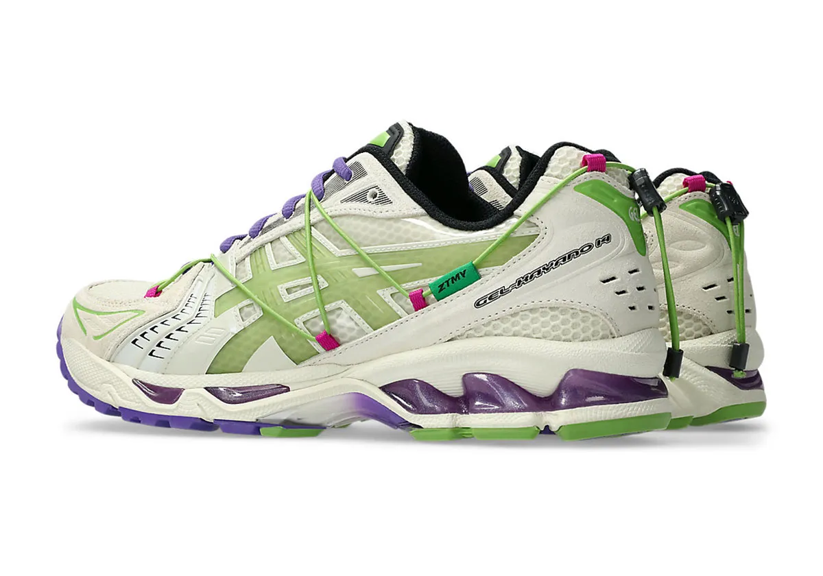 Dès le premier regard, ce modèle se distingue par une palette sophistiquée : une tige en mesh blanc cassé qui offre légèreté et respirabilité, accompagnée de superpositions en suède et caoutchouc dans des tons vert citron “Green”, ponctués de touches magenta et violet qui capturent l’esprit visuel de ZUTOMAYO.