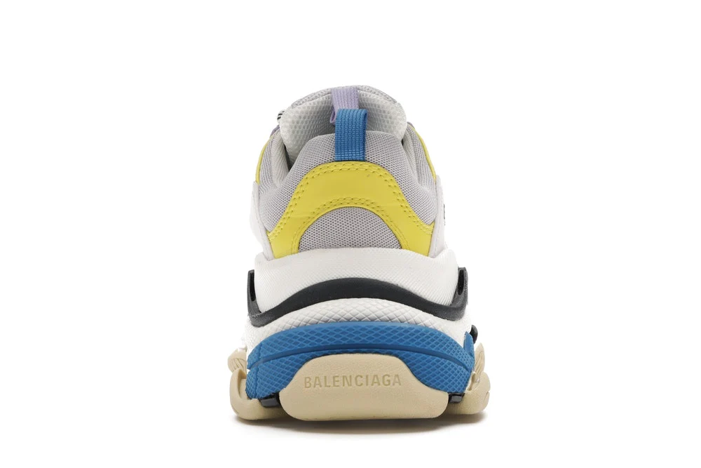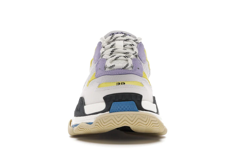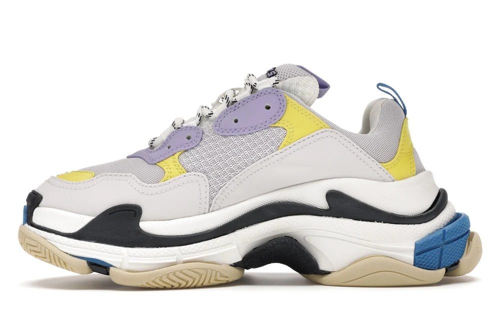 Avec la Balenciaga Triple S Purple Yellow Blue, chaque pas devient une expression de créativité. Ce modèle mêle avec audace des touches de violet, jaune et bleu sur une base en off white, offrant une palette de couleurs équilibrée et dynamique. Sortie en 2020, cette sneaker continue d’incarner l’essence même de l’audace stylistique que Balenciaga sait insuffler à chacune de ses créations.
