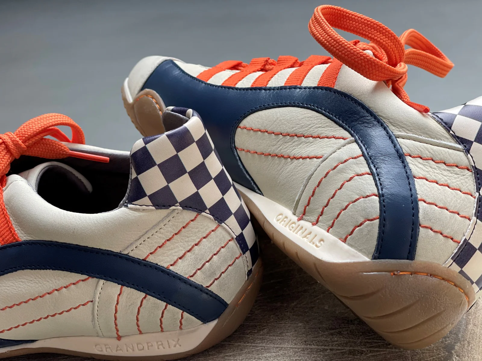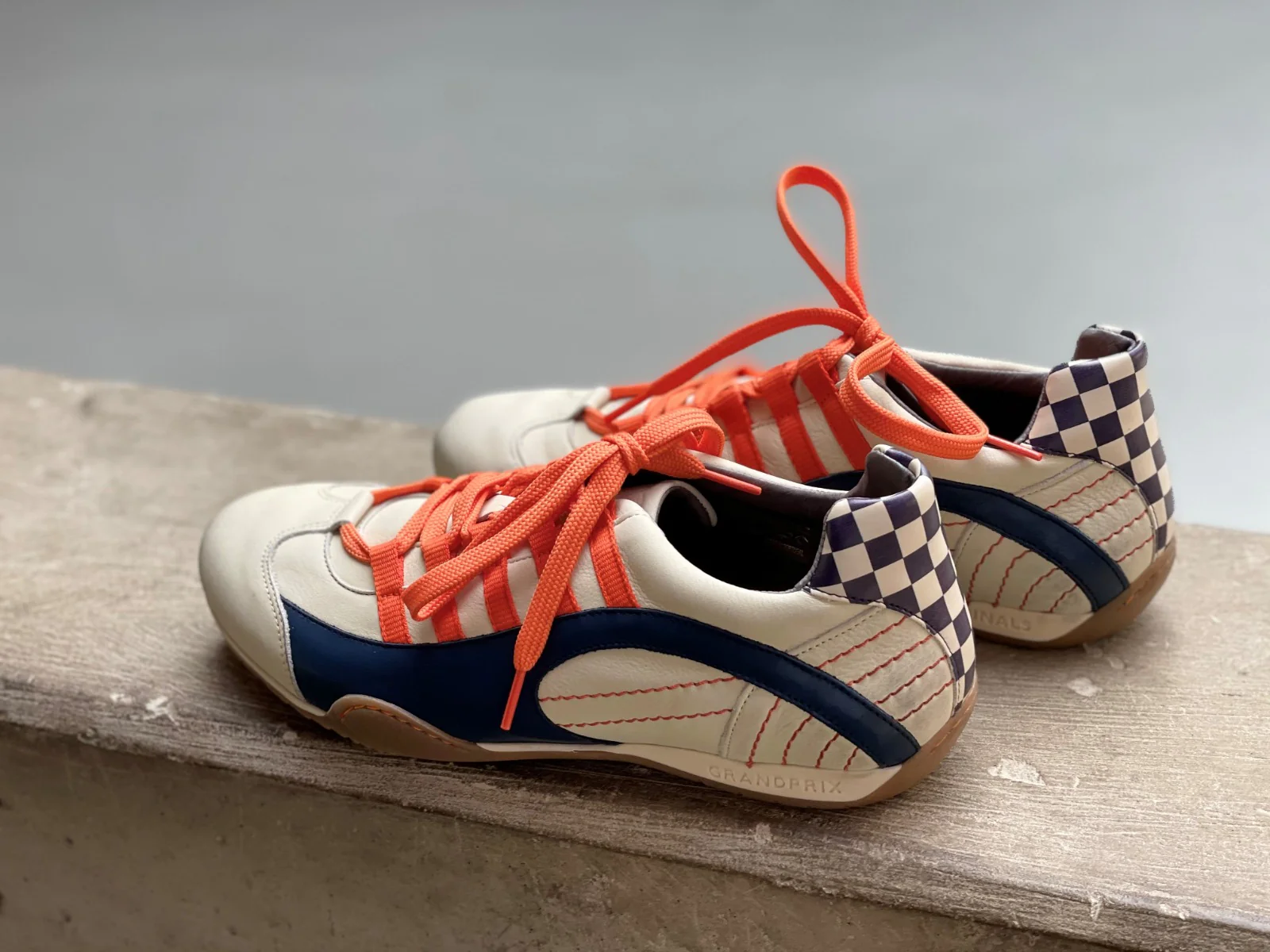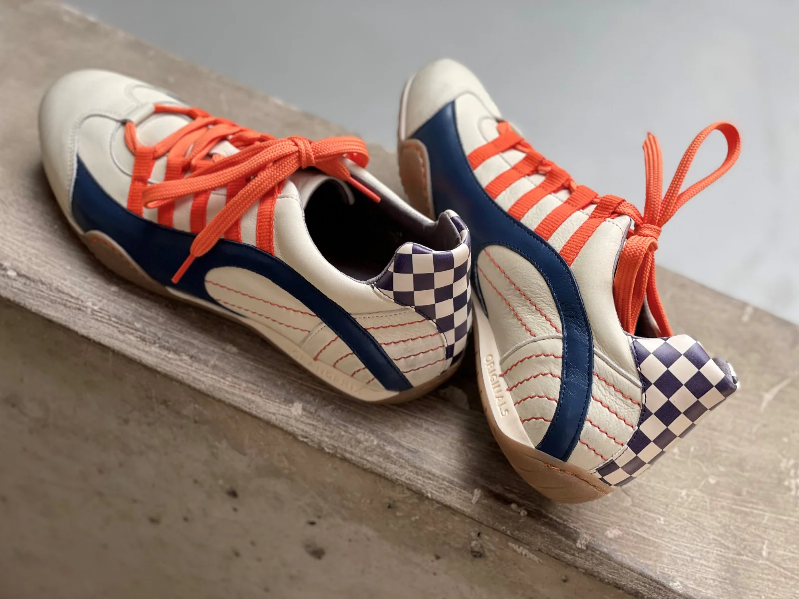 - Couleurs principales : Blanc cassé/Bleu Navy/Orange/Blanc/Noir