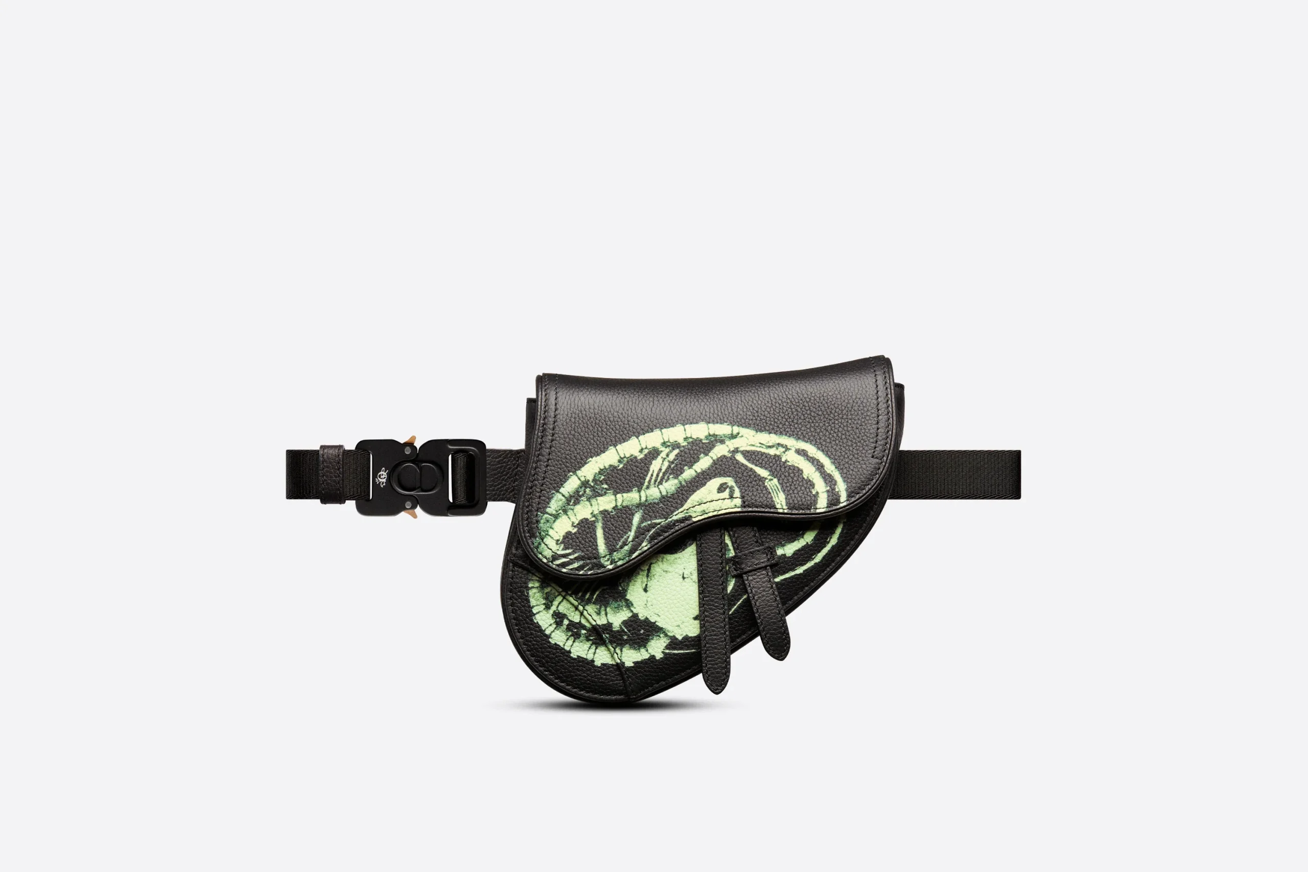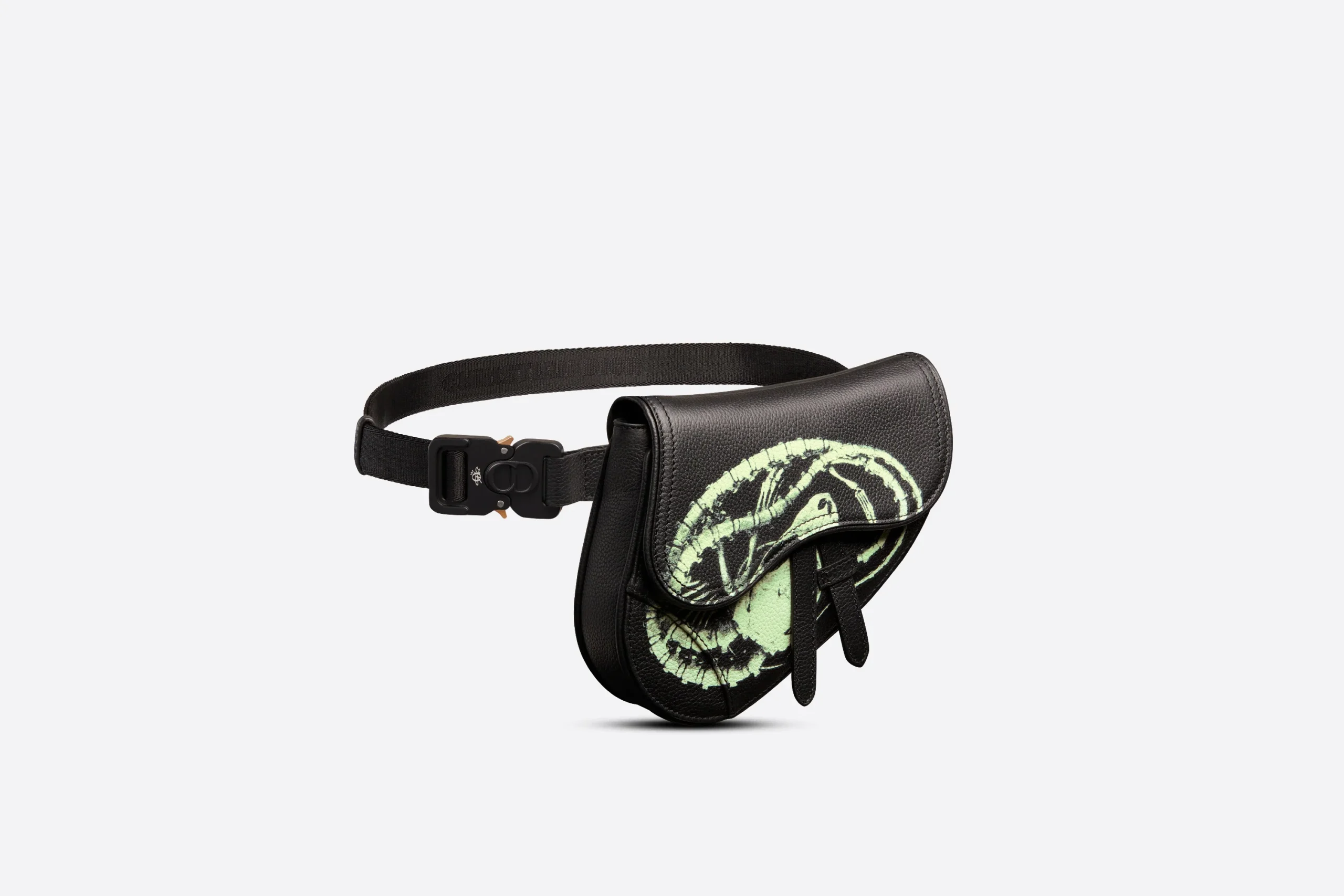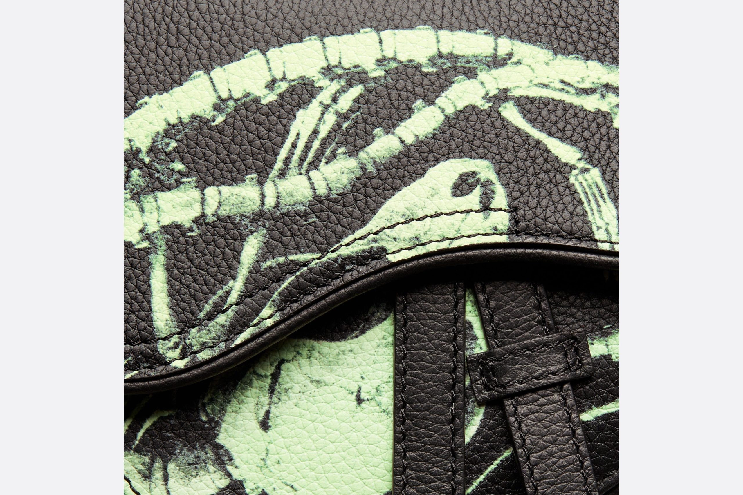 Le mini sac Saddle est issu de la collaboration exclusive avec CACTUS JACK. Confectionné en cuir de veau grainé noir, il est sublimé par un imprimé CACTUS JACK DIOR phosphorescent. Il est doté d’un revers aimanté aux lignes iconiques dévoilant un compartiment spacieux. La bandoulière ajustable et amovible offrira un porter à l’épaule, crossbody ou à la taille.