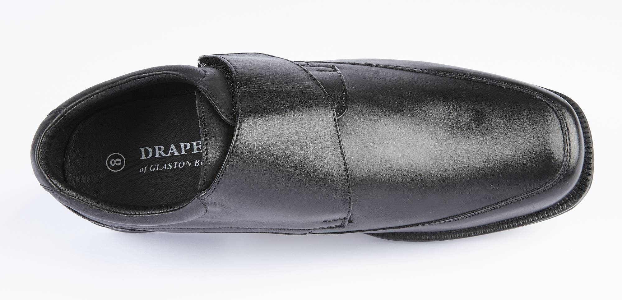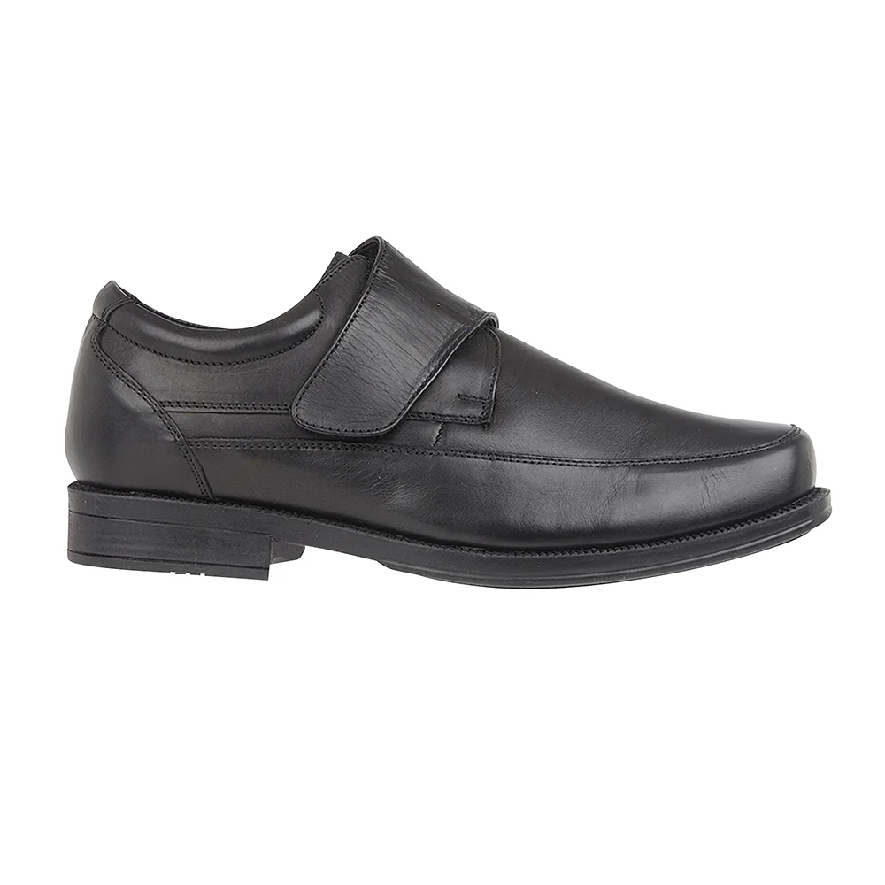 A velcro fastening monk shoe, with genuine soft leather upper, soft leather lining, and cushioned leather insole. There is plenty of room at the toe area, and it has a rubber sole with a one inch heel. It is an H Fitting shoe (wider than regular)