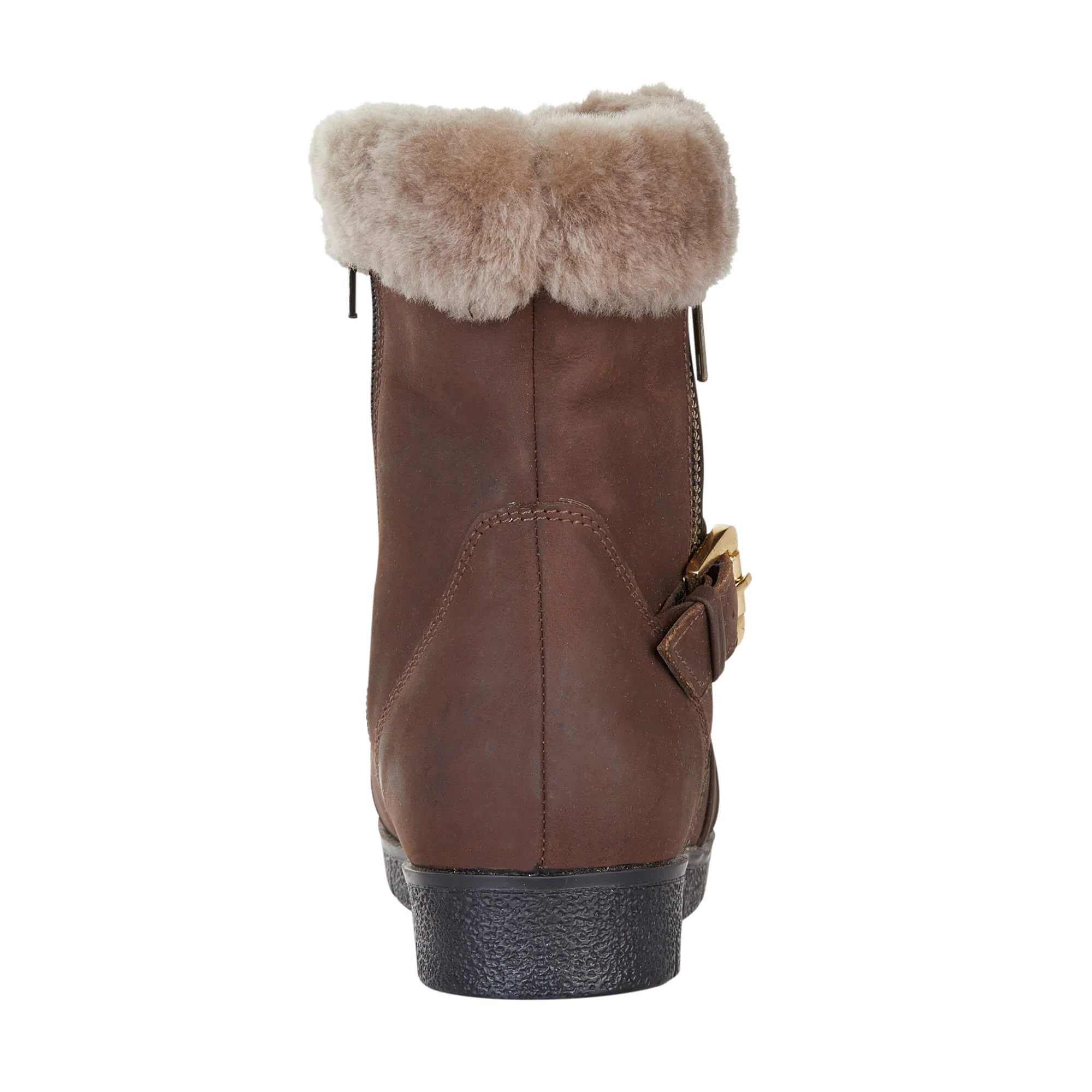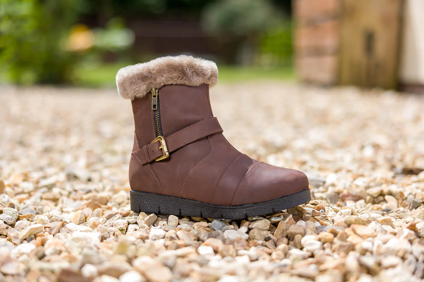 Our women’s side buckle boot. With a real sheepskin lining throughout including the insole, a durable non slip rubber wedge sole and a waxed leather upper which is water resistant. Super stylish, warm and practical too.