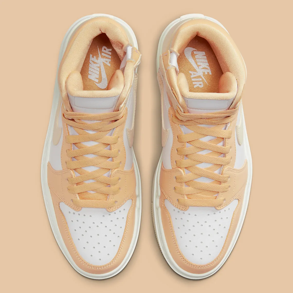 Une couche de base en cuir lisse d’un blanc éclatant revendique de manière typique les panneaux de l’empeigne, du milieu du pied et de la languette, tandis que différentes nuances de « orange arctique » enveloppent les superpositions environnantes. Allégé en une pêche douce au niveau de son Swoosh, de son col relevé et de son contrefort de talon, le bloc de couleur principal bénéficie d’un placement dominant tout au long de son garde-boue, de ses lacets, de son quartier, de sa doublure de chaussette et de ses panneaux supérieurs de cheville. De manière éprouvée, la semelle surélevée sous le pied prolonge une construction « voile » agrandie, terminée par l’offre pêche allégée équipant la bande de roulement en conclusion.