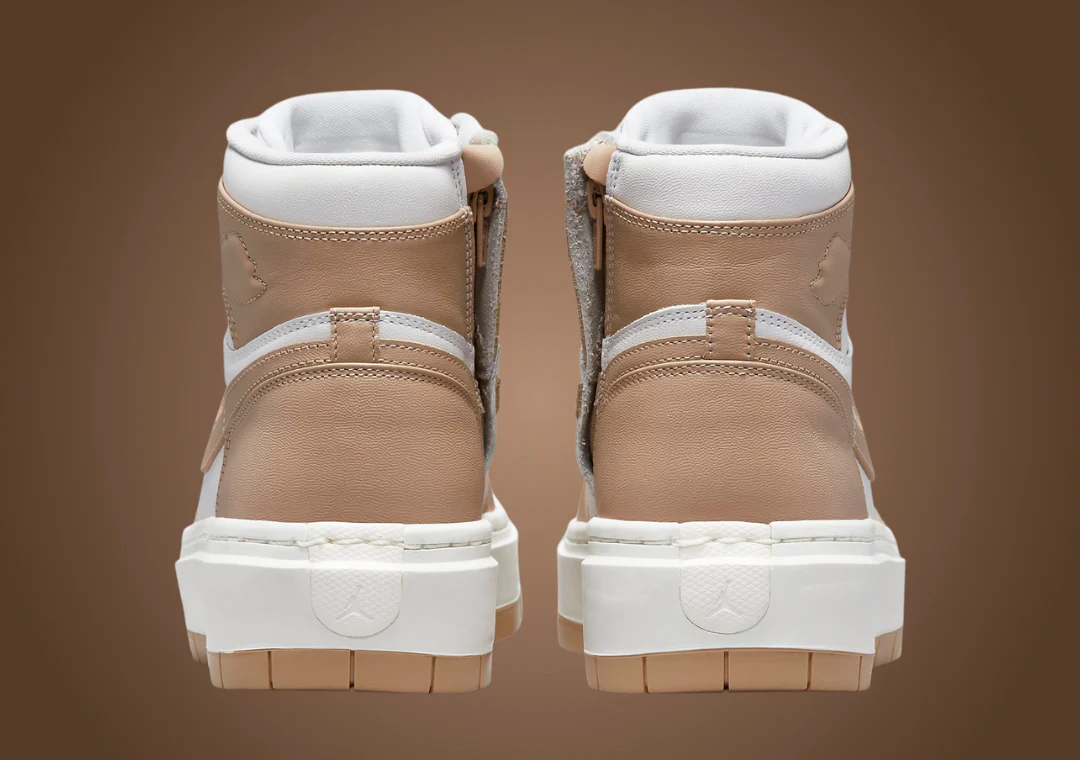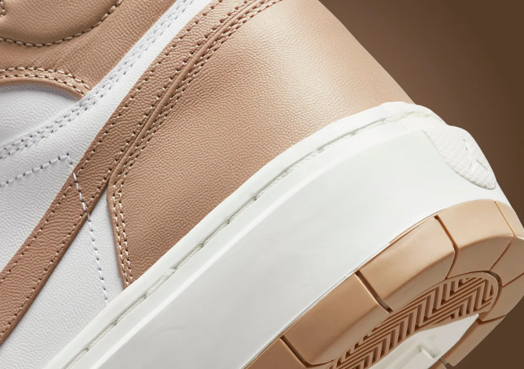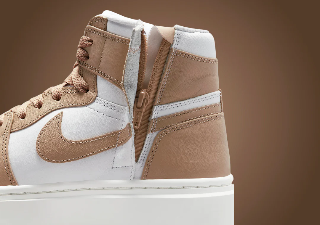 Fidèle à l’héritage de l’AJ 1, la tige présente une silhouette classique avec une construction entièrement en cuir, bien que certains détails soient confus. Le cuir blanc atterrit sur la pointe perforée, le milieu du pied, le col et la languette, tandis que les différentes superpositions subissent le relooking désertique susmentionné. Des lacets beiges ton sur ton rehaussent l’étiquette de langue sans marque, empruntant le thème trouvé sur le contour du logo Jordan Wings le long du col. Sur le côté médial, une fermeture éclair est incluse pour permettre un enfilage et un retrait faciles, étant donné que la nouvelle hauteur élevée rendrait l’enfilage plus difficile. Enfin, sous les pieds, la semelle intercalaire AJ 1 retravaillée très épaisse est disponible dans une teinte voile avec une semelle extérieure bicolore en caoutchouc désert et voile.