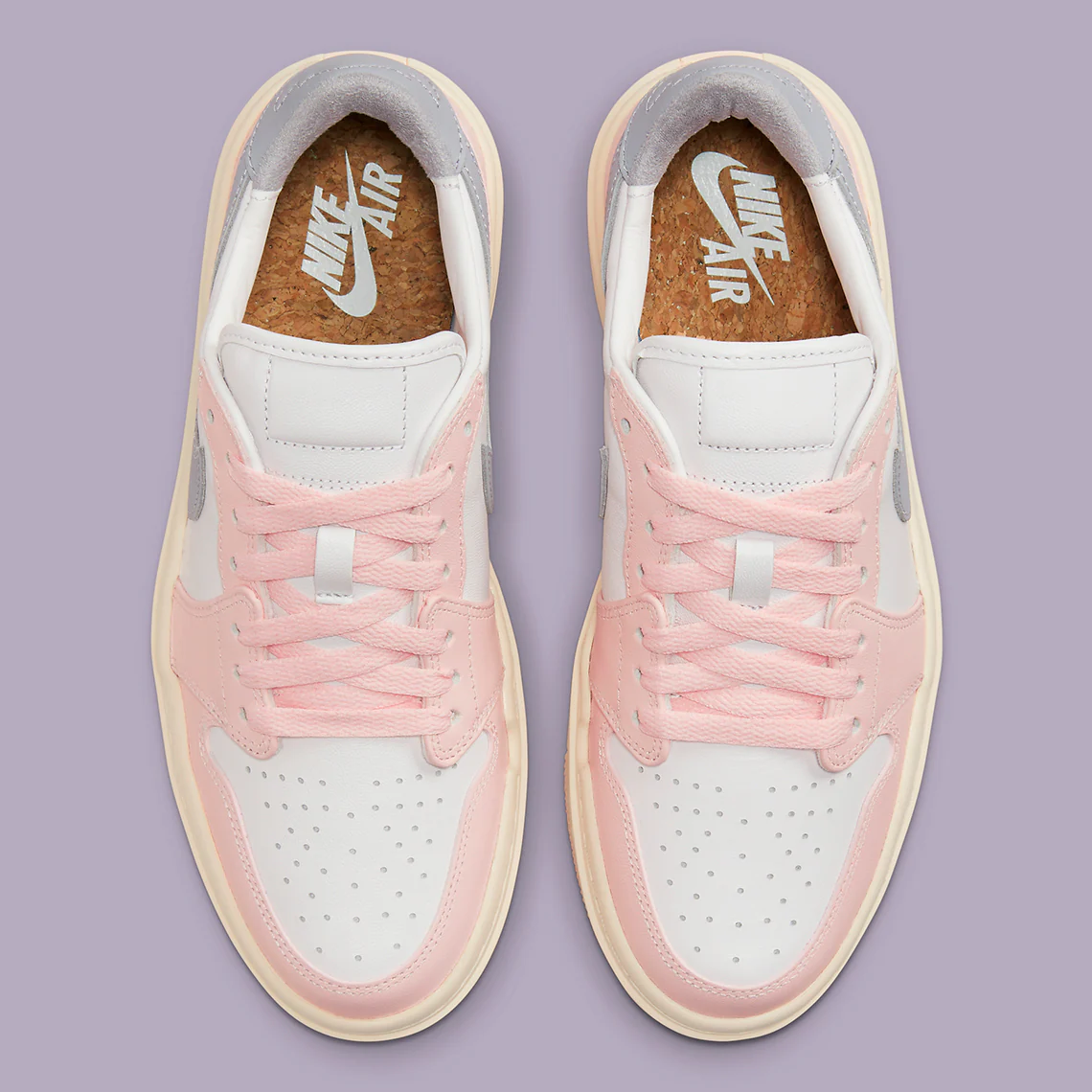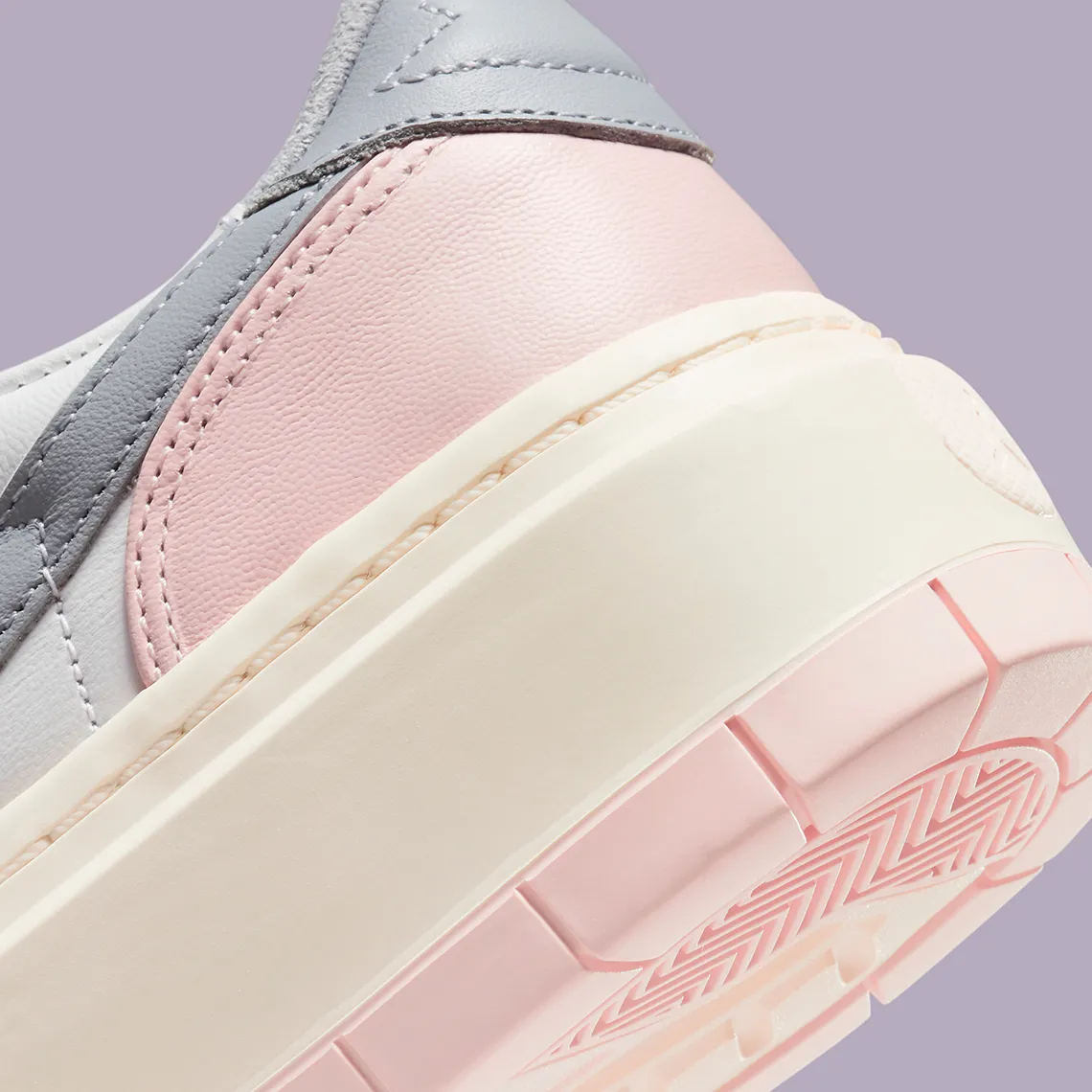 Cette proposition inédite, qui s’inspire de la Air Jordan 1 Low de 1985, est dotée d’une semelle exagérée qui surélève les porteurs par rapport à une paire traditionnelle (d’où le nom du modèle). La partie supérieure est en daim poilu, avec des sous-couches visibles au niveau des orteils et du milieu du pied, optant pour un look blanc cassé qui permet au moindre contraste d’être mis en valeur. Les panneaux autour de l’avant-pied, le long de la languette et sur tout le talon présentent un rose et un gris violacé discrets mais accrocheurs, la première teinte animant également la traction retravaillée sous le pied. Ensemble, tous les composants mentionnés ci-dessus contribuent à créer une Air Jordan rafraîchissante.
