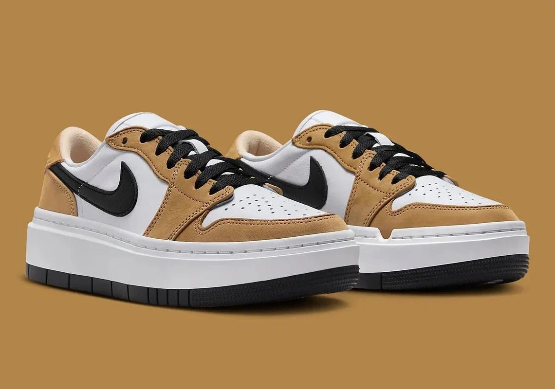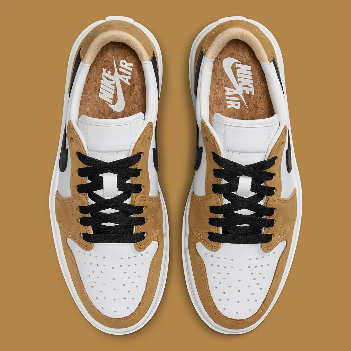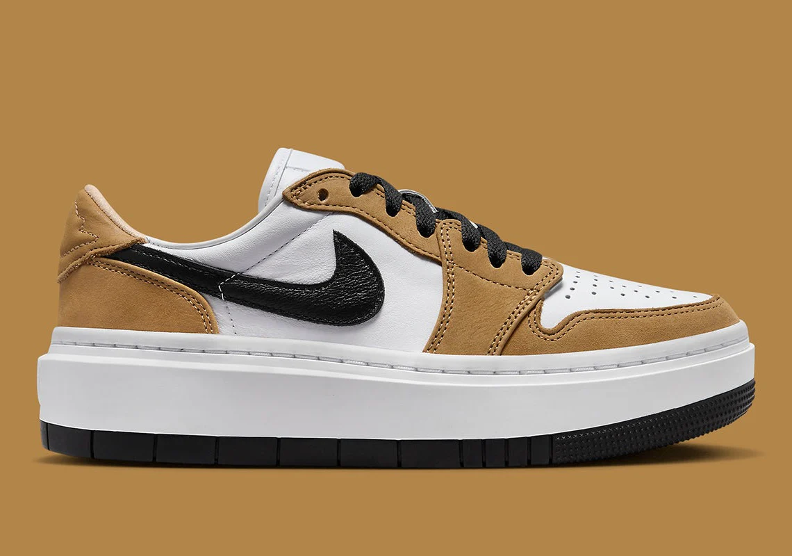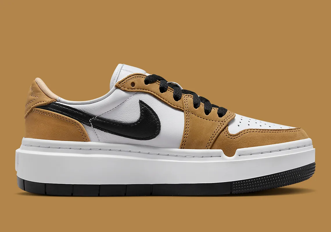Inspirée par la saison inaugurale primée de Michael Jordan en NBA, la combinaison de couleurs « Gold Harvest« , « Black » et « Sail » est apparue pour la première fois sur la Air Jordan originale en 2018. La palette de couleurs de la rétro s’inspire de la tenue d’un jeune gardien des Chicago Bulls lors de la cérémonie de la recrue de l’année en 1985, avec des détails sous les rabats de la cheville en clin d’œil à l’accolade. La proposition qui vient de faire surface n’affiche probablement pas les mêmes messages thématiques et les mêmes statistiques que son prédécesseur de quatre ans, mais son arrangement est trop proche pour ne pas faire le lien avec le drop précédent, en particulier si l’on considère que la Elevate a fait référence à d’autres styles emblématiques de la Jordan 1. Une grande partie de l’empeigne est empruntée au design de Peter Moore datant de plusieurs décennies, la plus grande modification de la sneaker arrivant sous la forme d’une semelle exagérée et à la pointe de la mode.