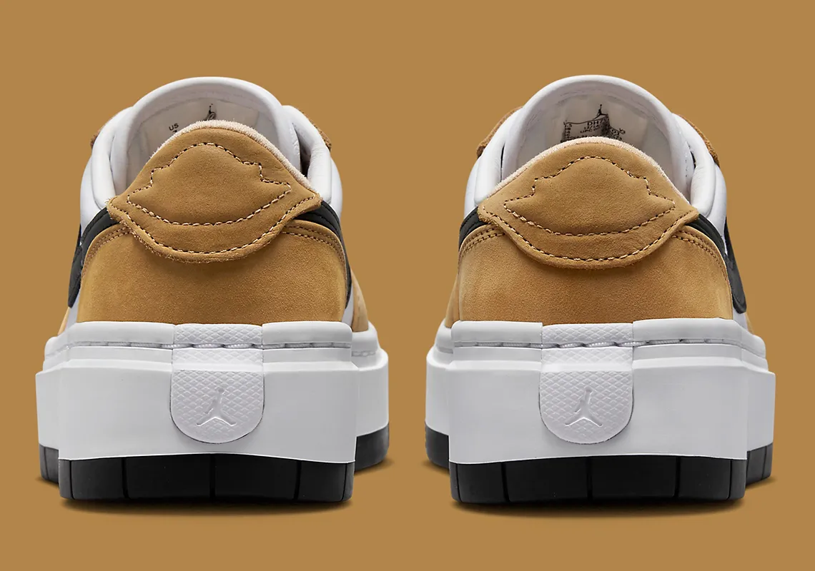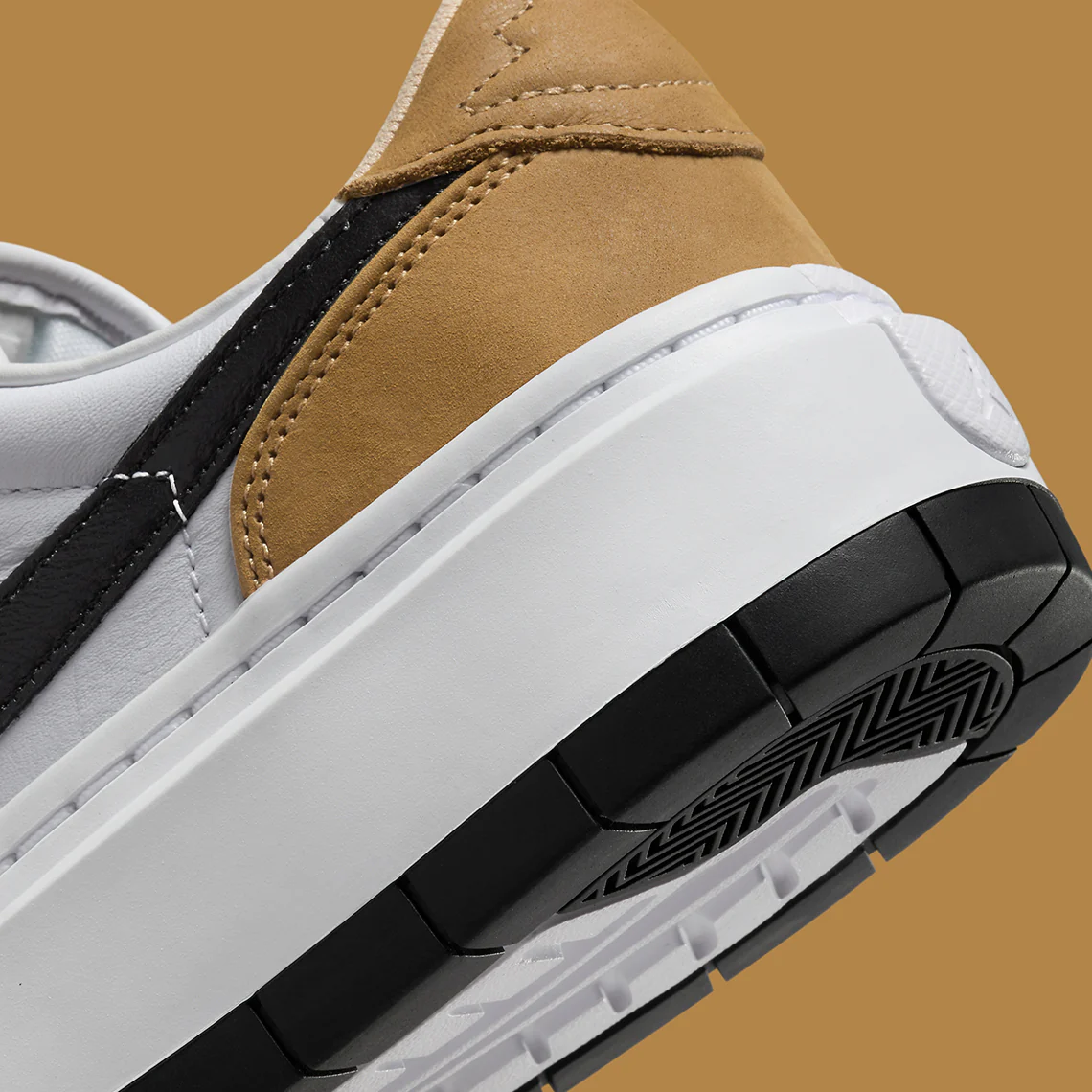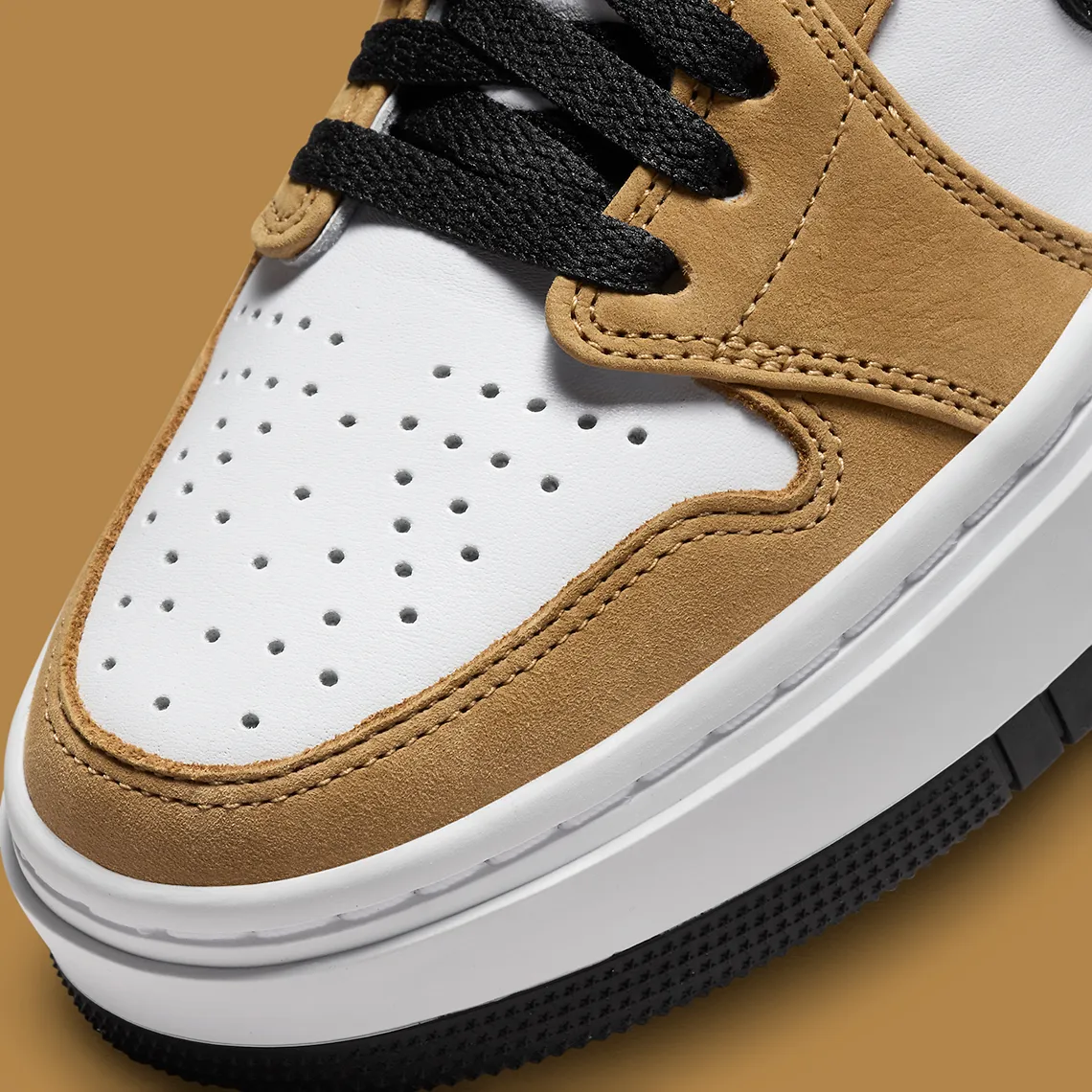 Inspirée par la saison inaugurale primée de Michael Jordan en NBA, la combinaison de couleurs « Gold Harvest« , « Black » et « Sail » est apparue pour la première fois sur la Air Jordan originale en 2018. La palette de couleurs de la rétro s’inspire de la tenue d’un jeune gardien des Chicago Bulls lors de la cérémonie de la recrue de l’année en 1985, avec des détails sous les rabats de la cheville en clin d’œil à l’accolade. La proposition qui vient de faire surface n’affiche probablement pas les mêmes messages thématiques et les mêmes statistiques que son prédécesseur de quatre ans, mais son arrangement est trop proche pour ne pas faire le lien avec le drop précédent, en particulier si l’on considère que la Elevate a fait référence à d’autres styles emblématiques de la Jordan 1. Une grande partie de l’empeigne est empruntée au design de Peter Moore datant de plusieurs décennies, la plus grande modification de la sneaker arrivant sous la forme d’une semelle exagérée et à la pointe de la mode.
