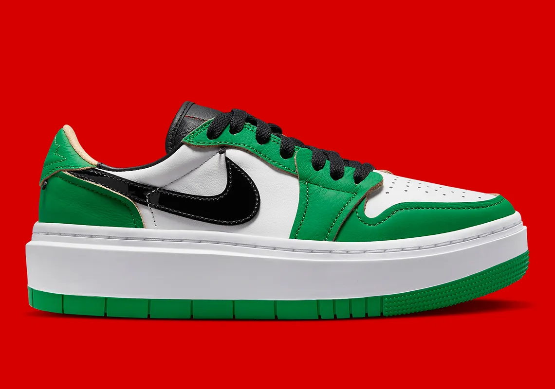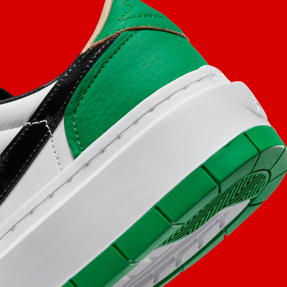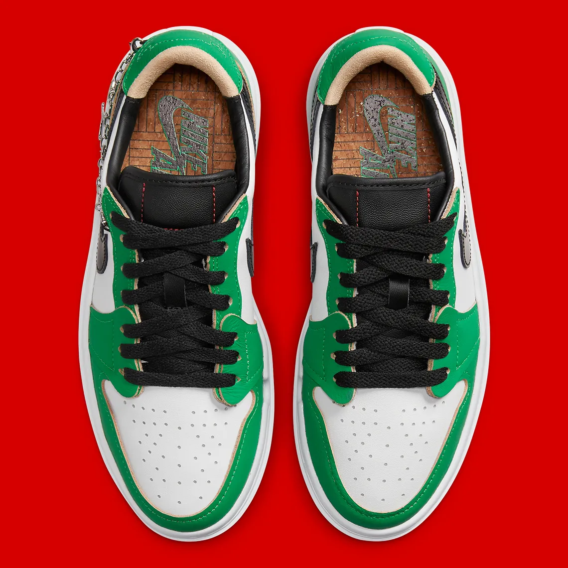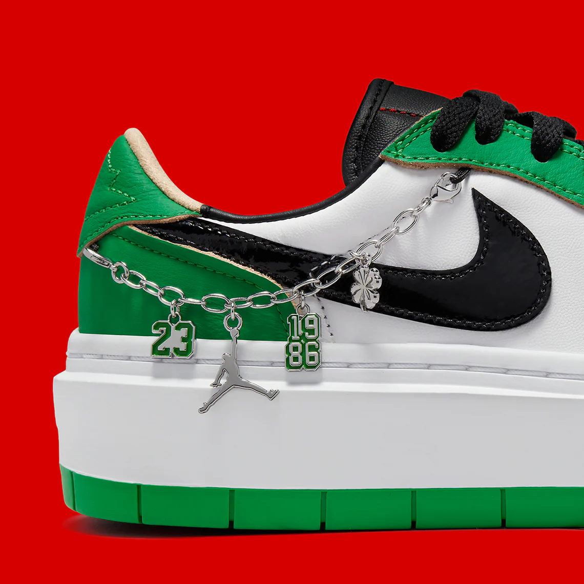 Tout comme sa contrepartie 2020 High, la Air Jordan 1 Low Elevate est traitée avec la teinte « Lucky Green » synonyme des Celtics le long de la pointe de l’avant-pied, du quart de la chaussure et de la languette arrière, avec une garniture en liège exposée, tandis que l’empeigne, le quart de la chaussure et la semelle intermédiaire optent pour un échantillonnage blanc propre. Le matériau en liège qui préside à la création de la chaussure se retrouve sur la languette arrière et la semelle intérieure, avec un logo NIKE AIR bordé de noir et de vert. La palette sombre se poursuit avec les lacets entièrement noirs, la construction de la languette et les swooshes brillants, tandis qu’un soupçon de surpiqûres rouges apparaît sur la languette en cuir de la chaussure, comme sur la version 2020. Et pour rester dans l’inspiration des spectres tonaux, un bracelet en métal équipé d’un Jumpman, d’un trèfle, d’une breloque « 23 » et « 1986 ».