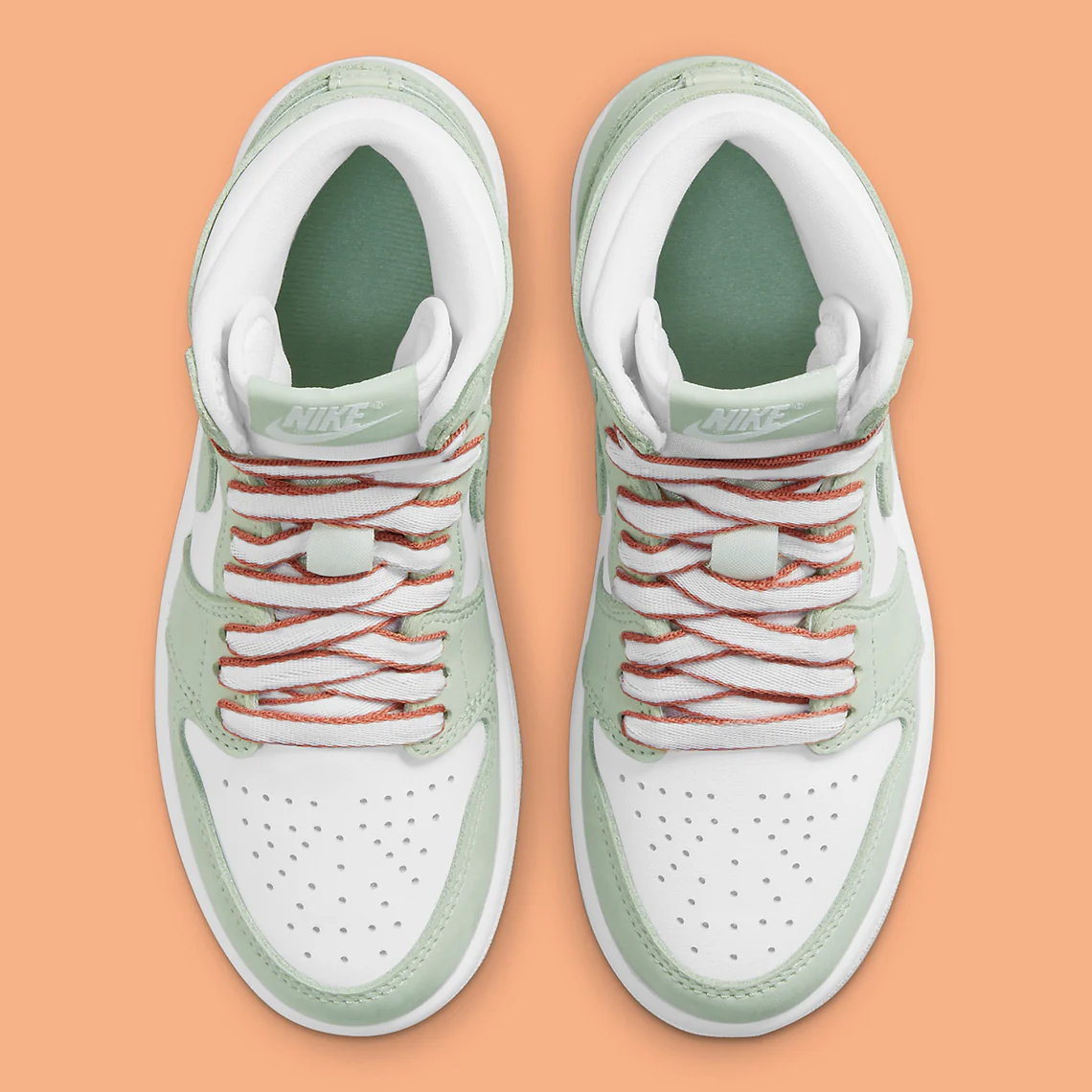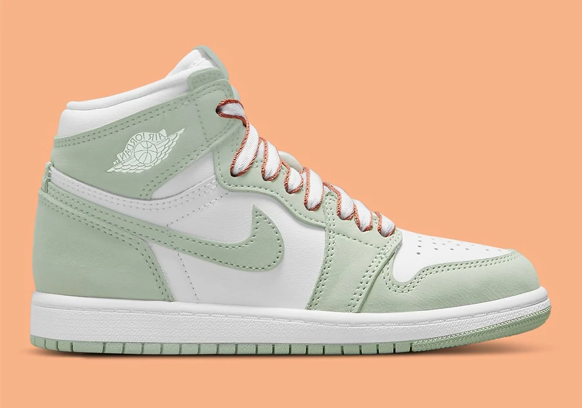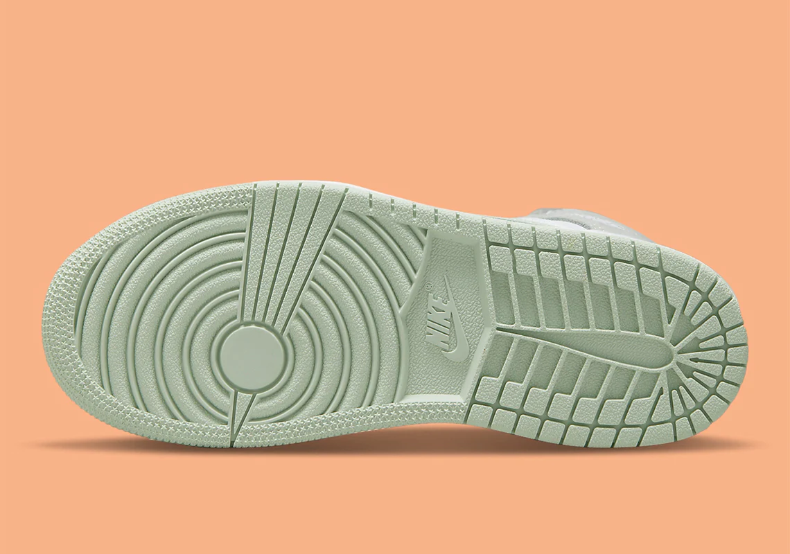 La Jordan 1 High OG Seafoam aborde une couleur verte titulaire pâlit les superpositions partout. Chaque accessoire en cuir, de l’embout au Swoosh, est également légèrement dégringolé, offrant une texture assez premium par rapport au fond de teint blanc en dessous.