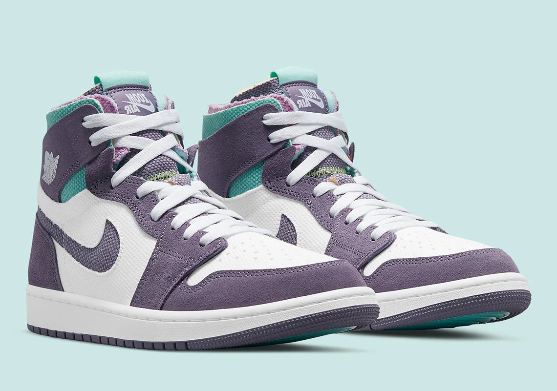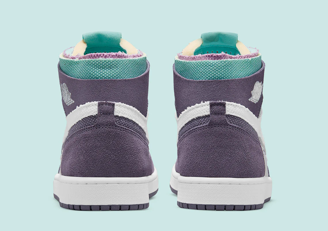 La couleur titulaire «Daybreak» prend rapidement la barre, colorant les panneaux de suède qui sont répartis sur tout le cadre. De plus, il s’étend même vers le Swoosh en retrait dont la fabrication en maille contraste fortement avec sa base blanche fibreuse similaire. Les insignes des ailes, les lacets et les semelles intercalaires sont également achromatiques, bien que l’on ne puisse pas en dire autant du col dont les fines couches passent d’un bleu aqua brillant à un violet filtré plus pastel.