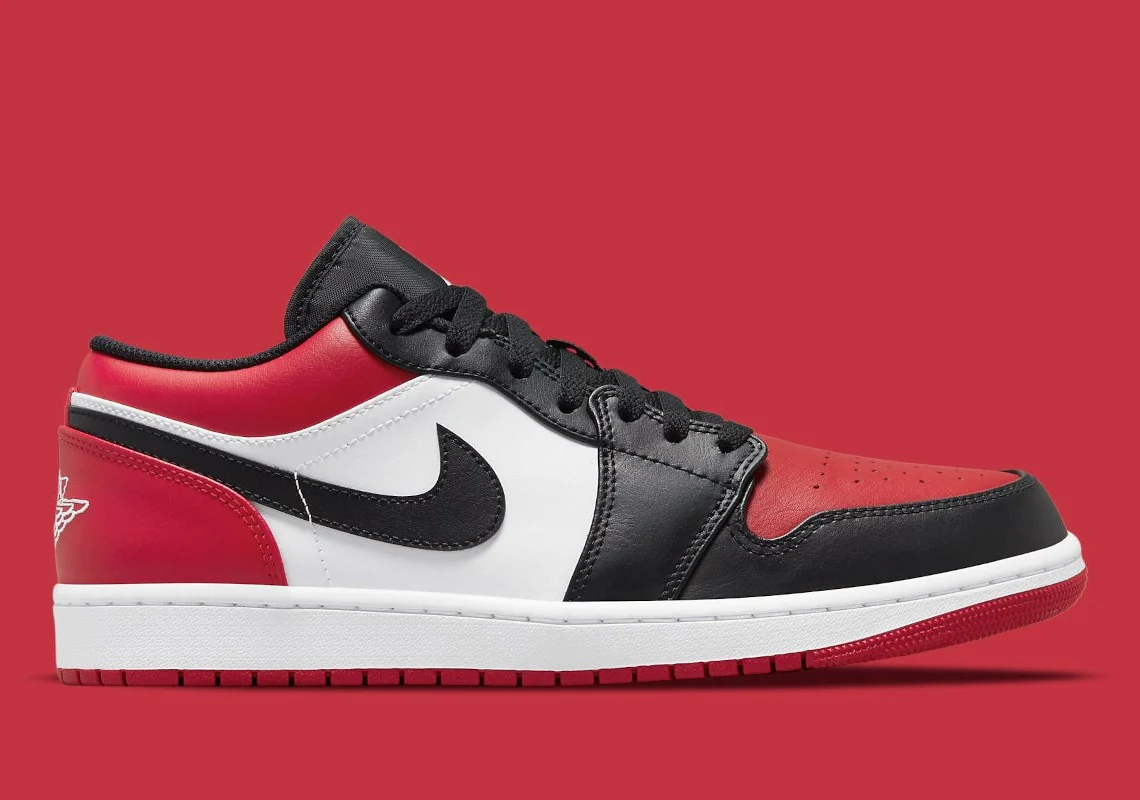 La Air Jordan 1 Low « Bred Toe » ressemble à la fois aux Chicago Bulls et à un coloris original de la première chaussure signature de Michael Jordan pour l’inspiration du design. Vêtue des couleurs de l’uniforme de l’ancienne équipe de basket de Jordan, cette variante basse de la chaussure de basket vintage reproduit le bloc de couleur de la Jordan 1 « Black Toe » originale portée par Jordan lors de sa saison recrue, avec une touche d’originalité. Au lieu d’un orteil perforé en cuir blanc comme on le voit sur l’original, le « Bred Toe » moderne a un orteil perforé Gym Red avec des superpositions en cuir noir contrastant sur l’embout, l’avant-pied et les œillets. Ailleurs, du cuir blanc apparaît sur le panneau central et du cuir Gym Red se trouve sur le col et le talon. Un Swoosh en cuir noir réside des deux côtés et un logo « Wings » blanc est brodé sur le talon.