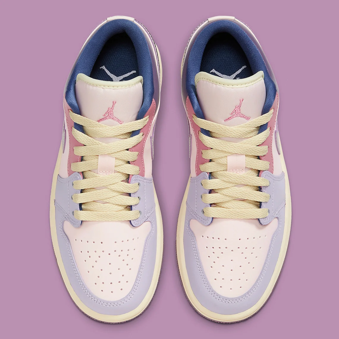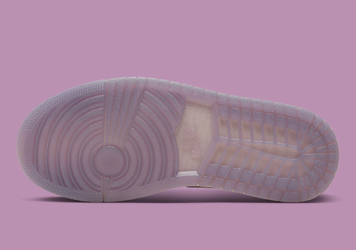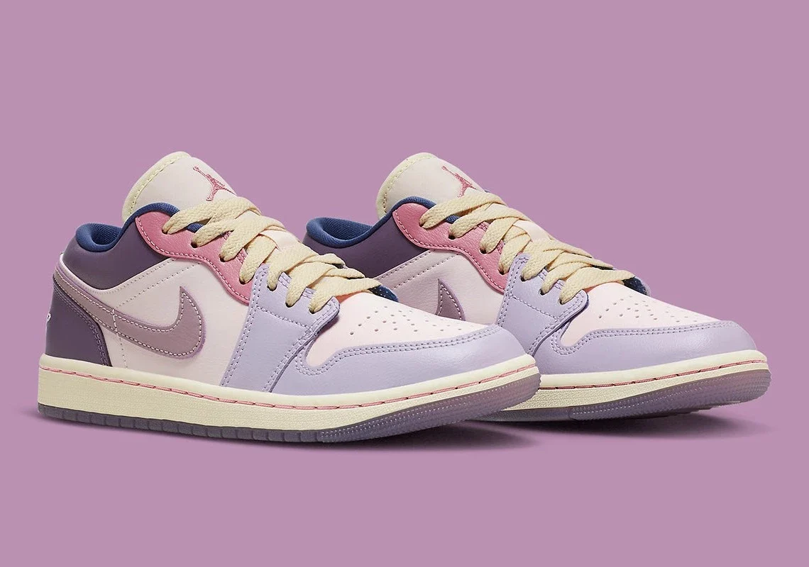 Pour commencer, des teintes violettes sont disposées le long de l’orteil, complétant les violets plus foncés qui habillent la semelle extérieure, le col et le talon. Le Swoosh, en léger contraste, se situe à mi-chemin entre ces mêmes nuances et le rose clair utilisé sur les œillets, le marquage Jumpman et les coutures de la semelle intermédiaire. Enfin, la chaussure est complétée par des finitions plus désaturées : des touches de crème accentuent la languette, les lacets et le fond, tandis que la base opte pour une teinte florale extrêmement subtile.