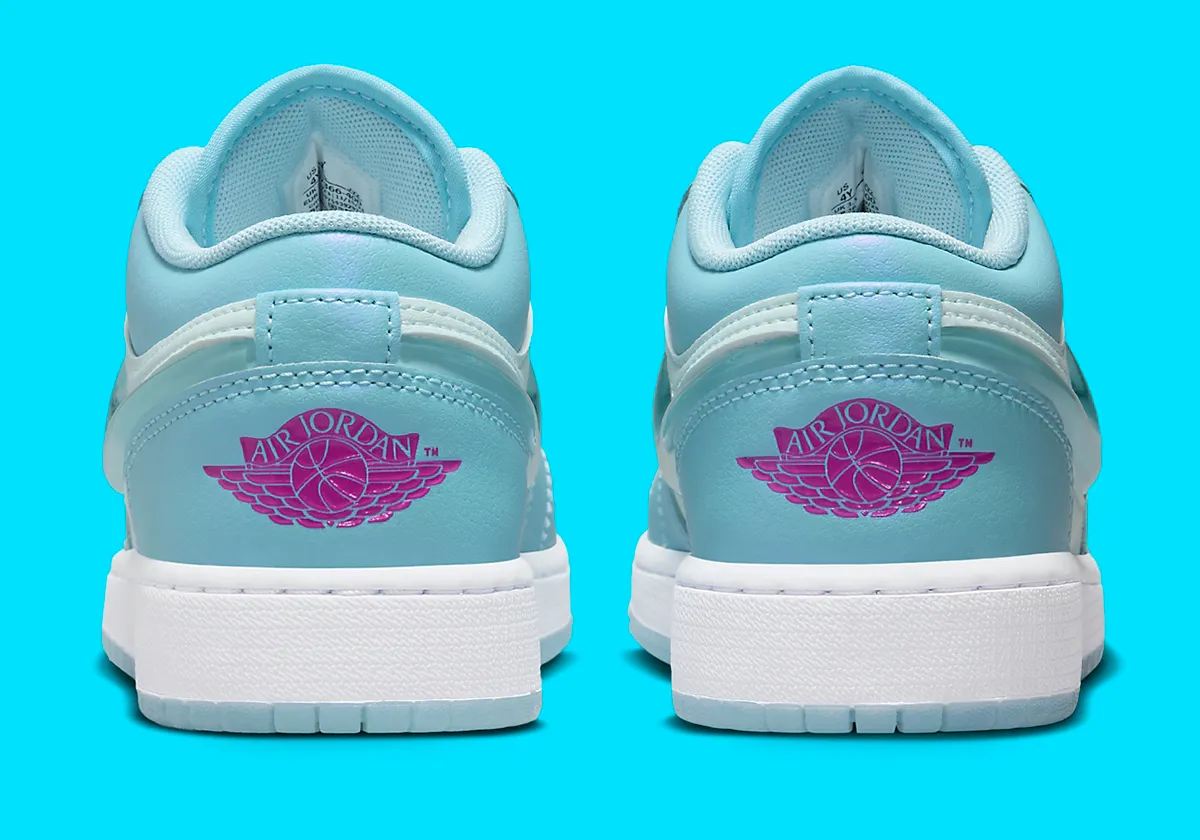 Les Air Jordan 1 Low, peut-être en raison de leur rôle de second plan par rapport à leurs cousines à la coupe plus haute, bénéficient d’une plus grande marge de manœuvre pour expérimenter leurs palettes. Pour la GS 1 Low présentée ici, le bleu glacial s’empare entièrement de la silhouette, avec des détails « Hyper Violet » qui renforcent le thème cool.