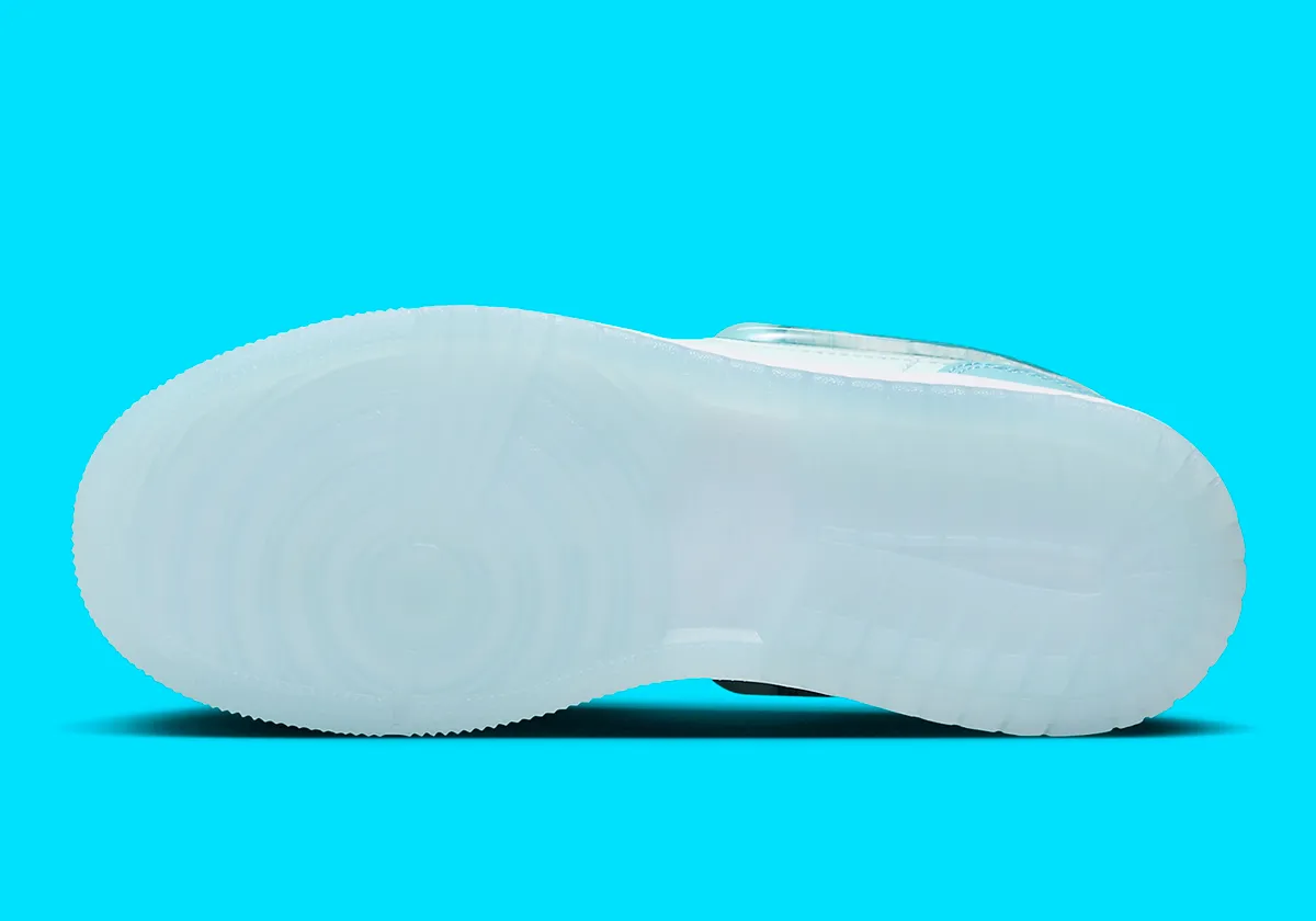 Une semelle translucide est loin de sortir de l’ordinaire pour les Jordans, mais la nouveauté sur la Jordan 1 Low « Glacier Blue » est le swoosh nacré qui court en parallèle. Il s’agit de l’expression centrale de la teinte titulaire, mais pas seulement – ce même ton peint la doublure de la chaussette et les recouvrements intérieurs de la tige.