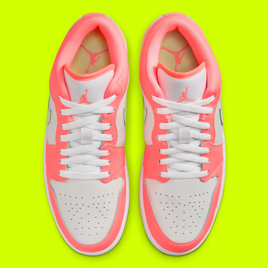 Introduite par une couche de base et une semelle intermédiaire d’un blanc éclatant, la solution aux teintes vibrantes étend les nuances « Lava Glow » sur les superpositions de cuir plat, la doublure intérieure et les logos sur la languette pour un ton primaire extrêmement lumineux. Les couleurs rose néon renforcent la dominance de cette dernière teinte le long de la bordure de la languette et sur les logos de la semelle intérieure, tandis que le Swoosh au milieu du pied et la bande de roulement sous le pied s’habillent d’une conclusion « Barely Volt » complémentaire.