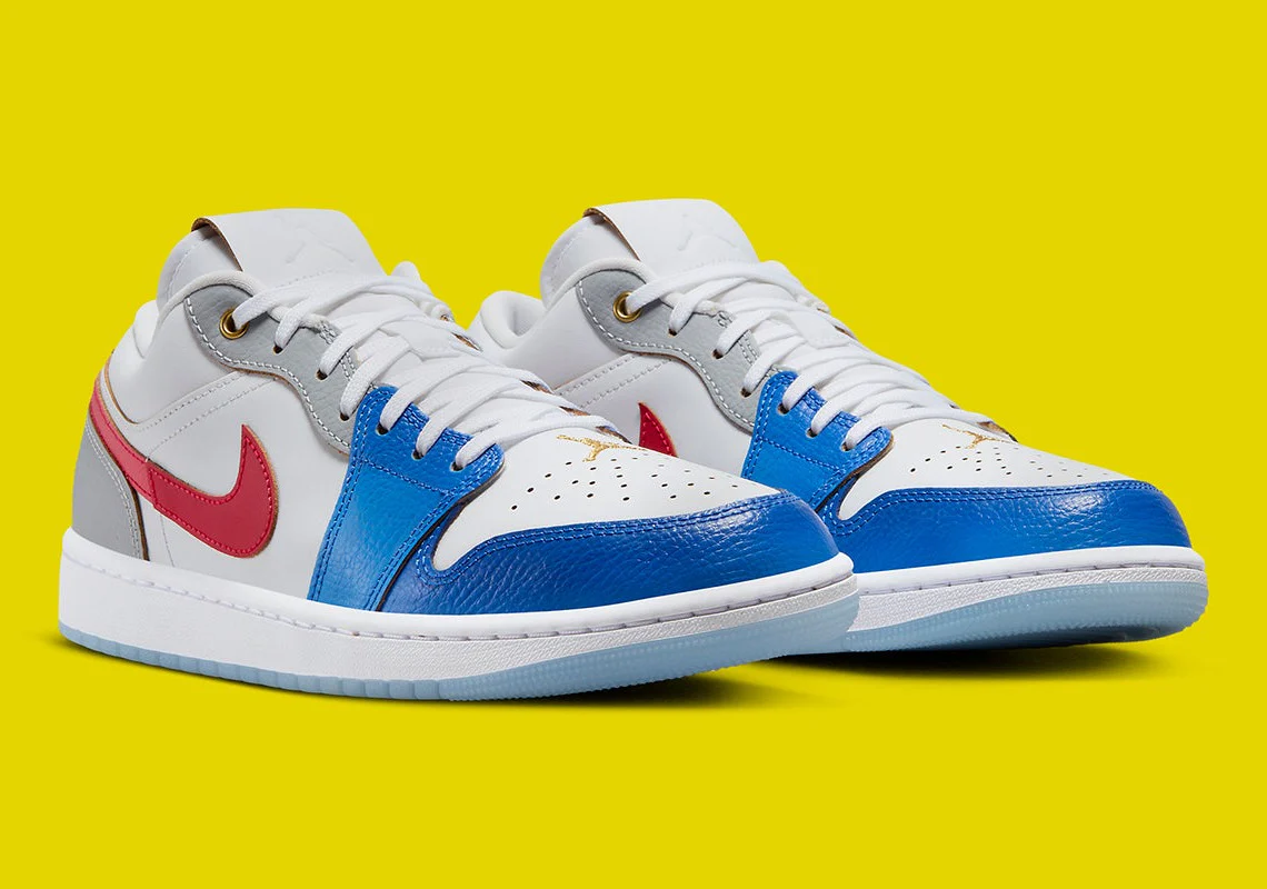 Récemment, la silhouette low-top est apparue dans un mélange de couleurs blanc, bleu, rouge et or rappelant le drapeau des Philippines. Les couches de base en cuir présentent une finition « incolore » qui permet aux empiècements et aux détails de la chaussure d’être mis en valeur. Les panneaux autour de l’avant-pied optent pour un dégradé de bleu, tandis que les swooshes du profil se laissent aller à deux nuances de rouge différentes. Les bandes le long de la languette et autour de la partie inférieure du talon privilégient un ton gris discret qui laisse place à un contraste or métallisé via les œillets supérieurs et les insignes « Wings« , respectivement. Les semelles sous le pied complètent la Air Jordan 1 avec une bande de roulement bleu glacé qui complète le reste de la sneaker.