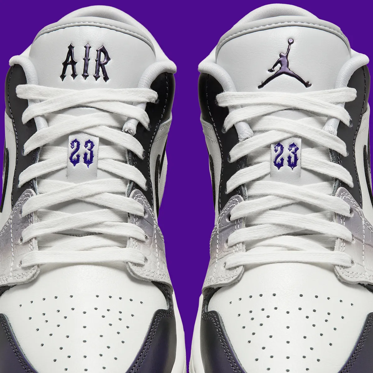 En se basant sur la Air Jordan 1 Low SE, Jordan Brand ajoute des éléments frappants qui rappellent l’esthétique des années 1970. Elle commence par une base blanche, noire et violette, tandis qu’un argent métallique brillant apparaît sur le talon en peau de crocodile et sur le panneau arrière. Le lettrage et la numérotation sur la languette sont exécutés de la même manière : une police de caractères audacieuse apparaît via le « AIR » sur la languette droite et le « 23 » sur le lacet. La pièce de résistance se trouve dans les bijoux métalliques qui pendent des lacets ; ces accessoires sont communs à l’esthétique Chrome Hearts qui a pris d’assaut le monde de la mode gritty.